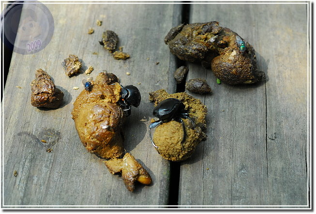 第一張照片是刻意放張遠觀的,因為事過境遷、情緒平復後再看近拍的第二張,還真有點作嘔的感覺。尤其邊吃早餐的芭樂,怎麼感覺這沱的主人也吃了...,為了避免荼毒讀者,所以放張「看不清楚的」。在八仙山,我們厭惡的東西,卻成一大群「逐臭之夫」大快朵頤的美味。當然蒼蠅不是主角,平地多得是,而是這三、四隻推糞金龜...但也保證看完這篇之後,下次在山上再遇見,應該沒人敢動手捉牠了。