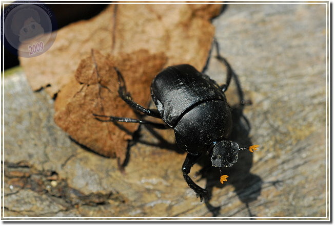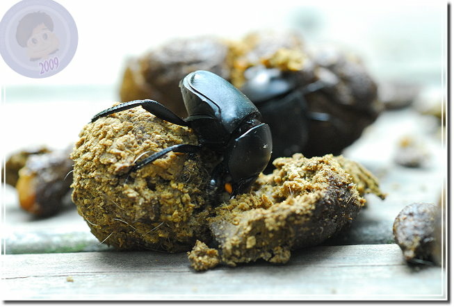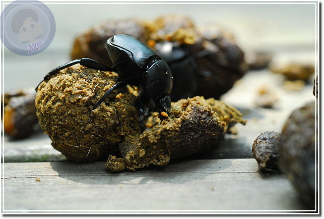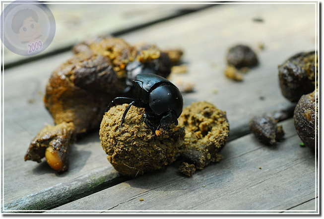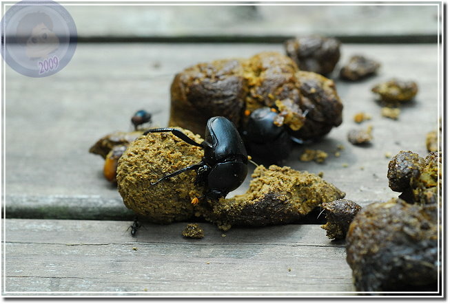 在木棧道上遇見的時候,已經有兩隻推糞金龜完成糞球,正滑稽且努力地推著。還兩隻趴在成條的糞便上努力地用頭試圖切斷糞便,沒錯...他們的頭長得像扁平的鏟刀,就是要低下來慢慢地鏟出個圓來。記得有一回在馬拉邦山的山腰上也遇見他們,當時他獨個兒在產業道路上晃,一群人還興沖沖地挪動他的姿勢拍照,一會兒落葉堆、一會兒樹幹上。下次,打死我再也不碰糞金龜了。