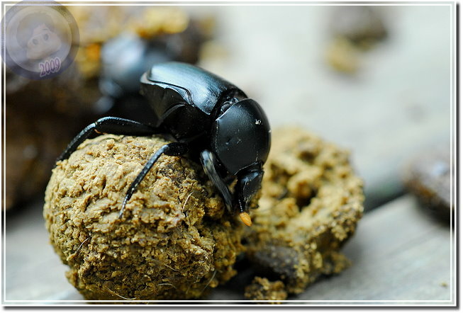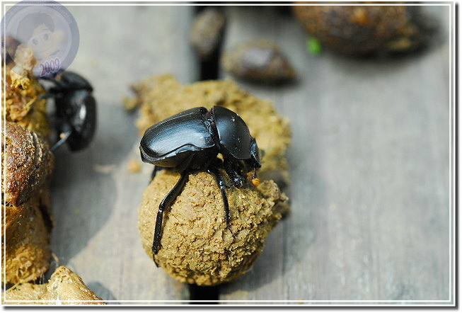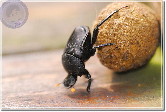 (推糞金龜體長2-3公分,全身黝黑,觸角末端黃色掌狀式特徵;頭部呈盾狀,用來切割糞便。會用腳將糞便搓成球狀,但在本次觀察中,推糞金龜用頭直接將糞球切成原形。糞球是糞金龜的食物,也是餵養幼蟲的材料)