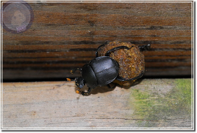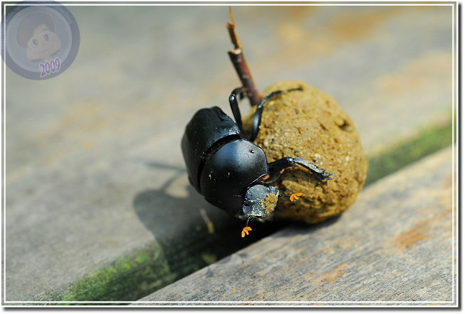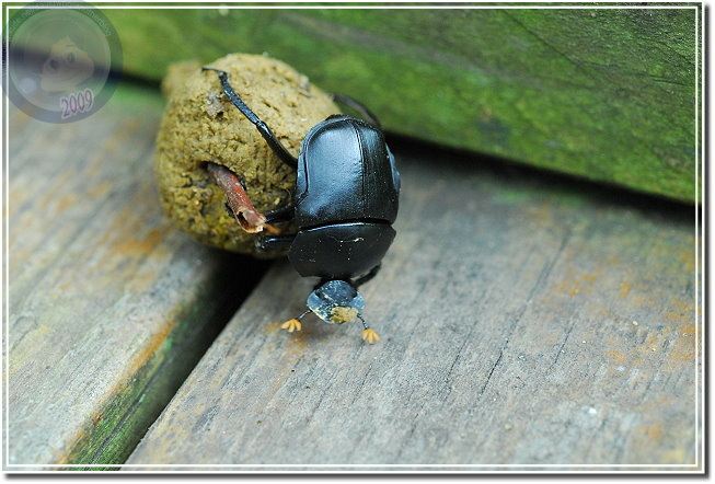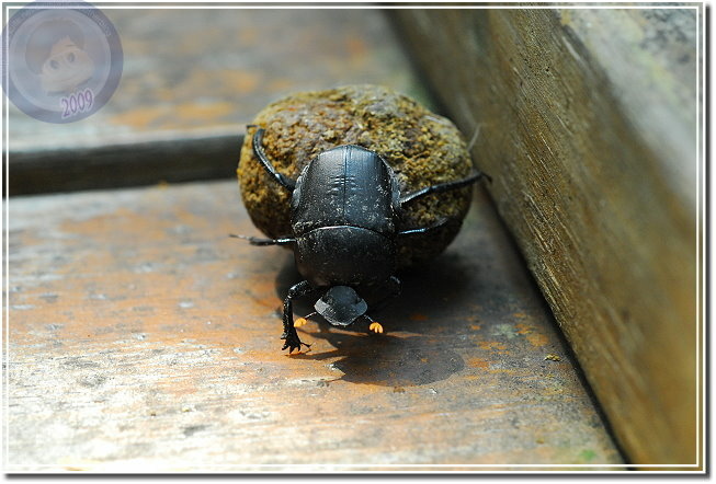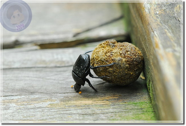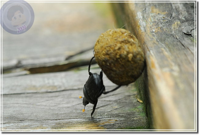 切完糞球,推糞金龜騎到球上,再利用重心移轉開始滾動。剛巧,有兩隻推糞金龜分兩路,一隻往上爬,用傳統我們熟知的方式,倒立著以後肢推著,東倒西歪、跌跌撞撞;另一隻走下坡,先爬上糞球,連球帶蟲咕嚕咕嚕地滾,那方式就不是出神入化可言,簡直是「蟲球一體」。蟲很小,想拍到他汗流浹背的模樣就必須趴在地上,上坡的還好,下坡的就唯恐「趴!」地撞上寶貝鏡頭,你能想像拿著單眼相機玩躲避球嗎?...還是不能有閃失的。棧道兩頭都有階梯,他們就想將球塞進階梯的接縫,無奈的球就是寬一倍,看他忙著上上下下,球還是紋風不動地卡著,如果不是八仙山之旅才剛開始,蹲著看他如何搞定鐵定是件趣味盎然之事。