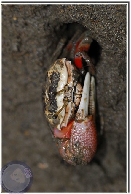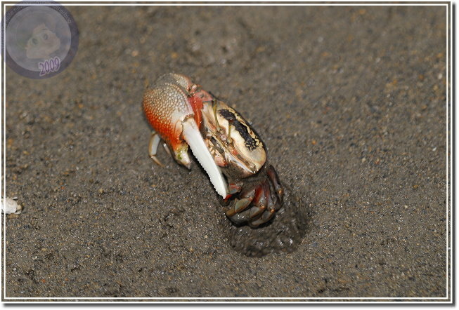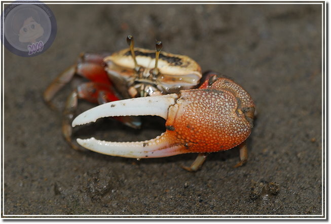 弧邊招潮蟹光甲殼就有 3、4公分寬,因為背甲上的紋路像黑網,所以又稱為網紋招潮蟹,其實他背甲尖刺下的弧形邊才是真正的得名特徵。紅樹林旁就是溫寮港,幾艘擱淺的竹筏湊巧當作地墊,我緩緩、偷偷地趴著朝下觀察著。招潮蟹只對移動的物體有感覺,所以只要輕輕挪移,近處幾隻會將動作放緩觀察,遠處的招潮蟹則是我行我素。只有我手壓麻了,撐起身體換姿勢時,所有的招潮蟹才會一溜煙跑個精光。但片刻,就會有先驅者慢慢地探出腳、螯、眼睛...一會兒又佈滿整個泥灘。