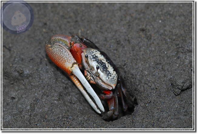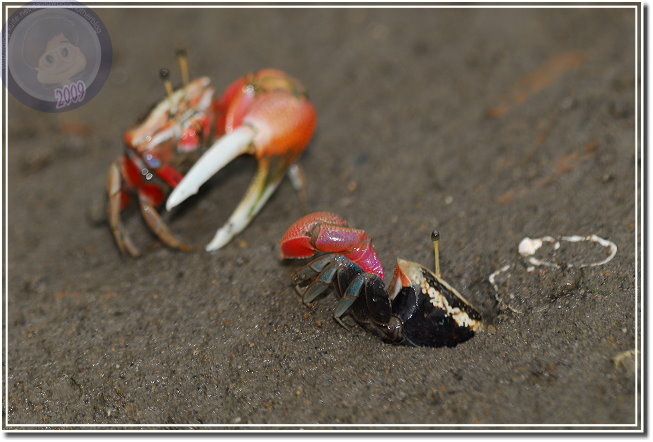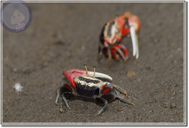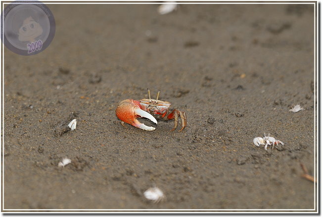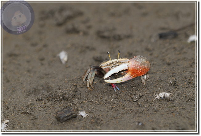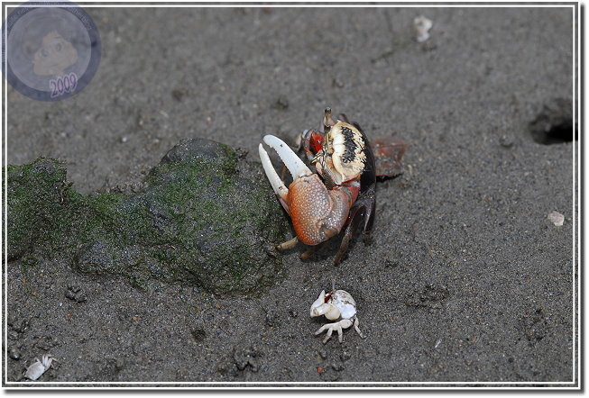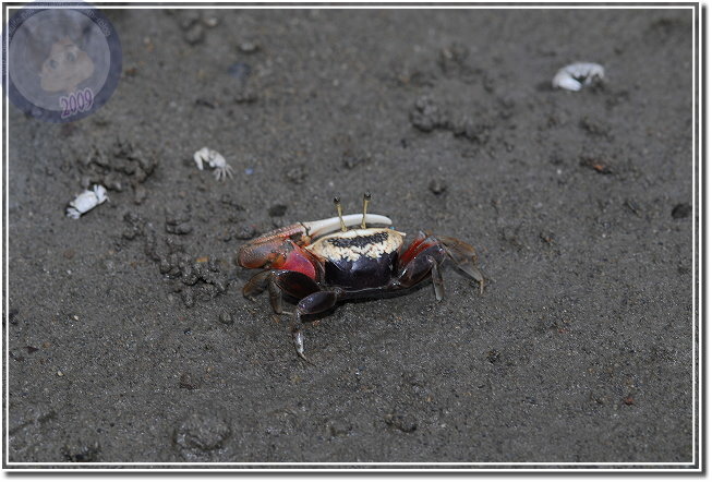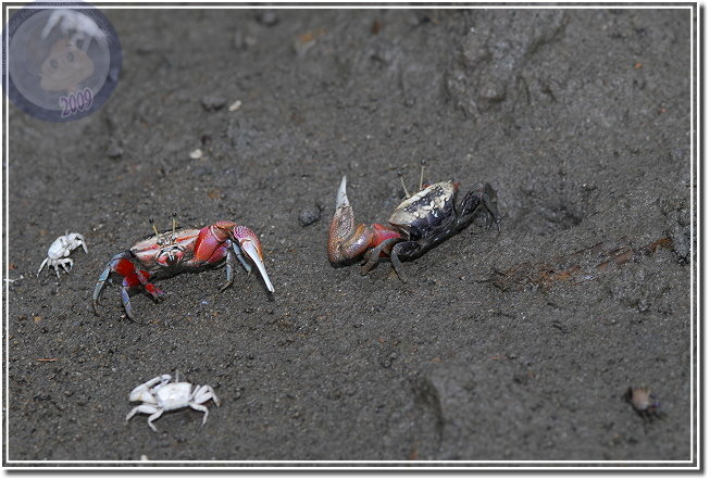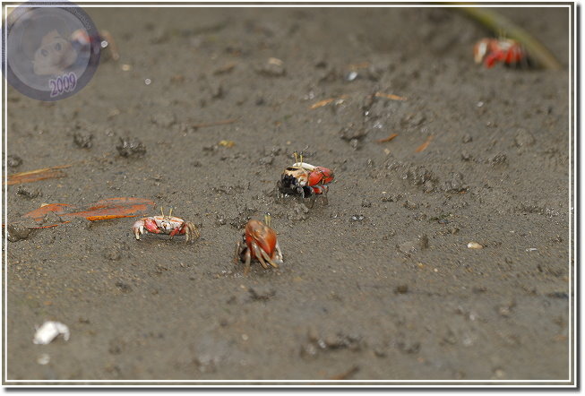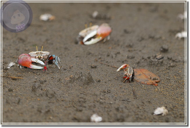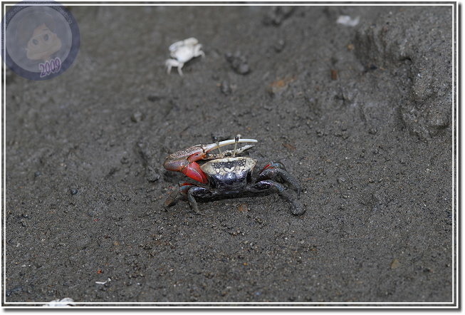 除了成熟的個體通紅之外,幼蟹渾身白皙。招潮蟹爬出洞,會將身體側向著洞口,方便橫行的自己飛奔進洞,我發覺無論他走多遠,總是會遵循這種預備姿勢。趴在筏上,除了快門聲,還可以聽見招潮蟹們用較小的螯「ㄐㄧㄐㄧㄎㄚㄎㄚ」地進食,偶爾兩隻公蟹撞在一起就會高高飛舞著大螯示威,通常體型較小的虛張聲勢之後會讓出路來,若是伯仲之間的就會來個摔跤,只要能將對手掀翻就算勝利,輸方會自動靠邊,甚至躲回洞裡。