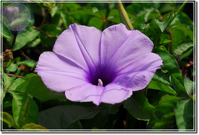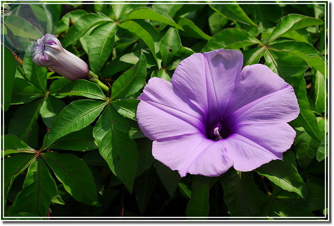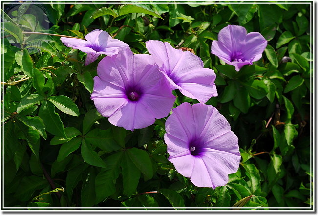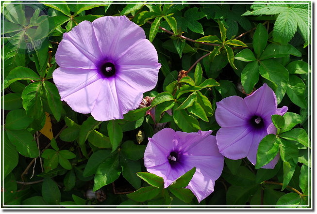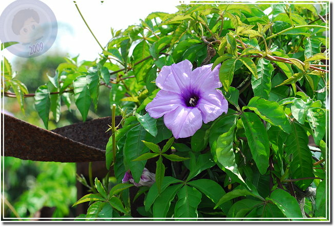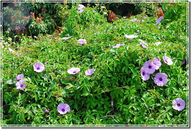這一叢槭葉牽牛花攀在路邊人家的車庫上,中午時分還有些老人家坐在對面大樹下,當我停下來拍照,還可以清楚地聽見議論紛紛,最後以一句「拍花啦!」做結論。轉角那戶人家鐵門裡有兩三隻狗,隔著門不住地狂吠,相信是我侵犯他們的「地盤」了。槭葉牽牛花是最最普遍的牽牛花,只要在平地的荒野、圍籬上看見牽牛花,十之八九都是它。剛開始我還分不清它與銳葉牽牛花的不同,後來發現槭葉牽牛除了葉子為掌狀,花色也較偏紅;而銳葉牽牛花葉則卵形,且花色偏藍紫色,顏色有深有淺,有時候還藍得相當過分,所以遠遠地或車子呼嘯而過的瞬間也都能分辨出來。