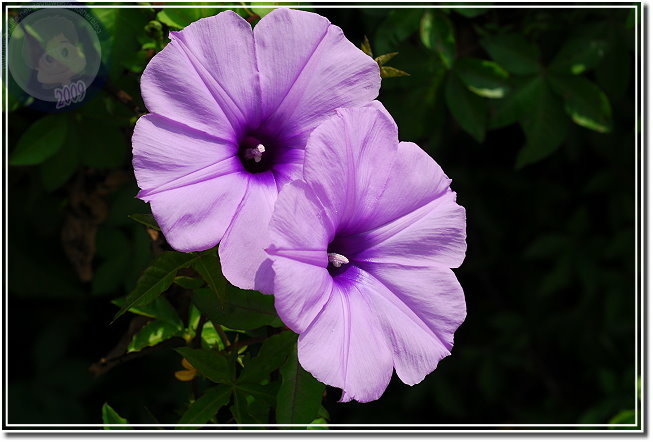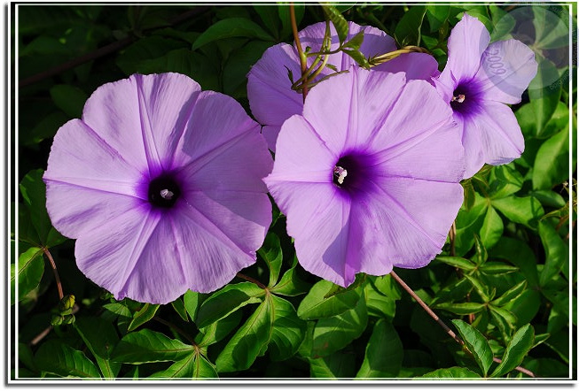 這一叢牽牛花花型碩大得過份,可能是鄰近果園也受到庇蔭。拍了一陣子之後,發覺鐵門裡的狗吠聲加雜著主人斥責,但狗兒對我的興趣似乎非常濃烈。說實在,怕了主人因為受不了狗聲而將他們放出來,那今天踩著腳踏車,可就不敢保證跑得贏,尤其那狗看來個頭都蠻大。為了還給農村一點點寧靜,我就不再翻找剛剛看見的小瓢蟲,蹬上車,還故作四下張望,別讓狗狗以為我怕了才離開,至少下回來...安靜一點、溫馴一點,不然我就將他們拍起來,關在我的部落格裡。
