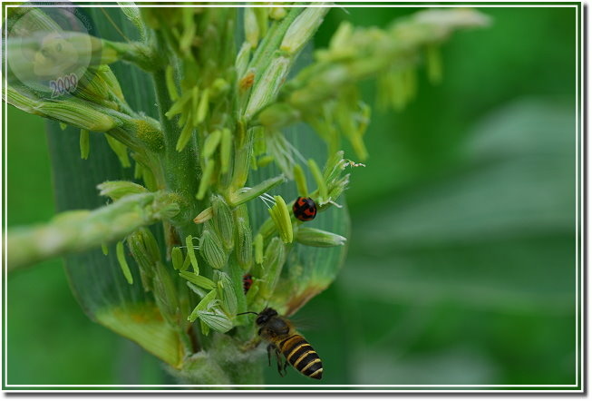 定個落落長的題目,因為照片就是環環相扣、一幕接著一幕被發掘而拍攝的。麥田對面老婆婆的菜埔多了玉米,我一直懷疑一棵玉米開花(不是爆米花,是玉米開的花)的順序,應該最近的一朵就在玉米梢上,等花開得差不多生長點往更高的高度竄去,所以玉米穗結在每棵玉米的腰上、腳踝上的現象就得到解釋;同時,玉米花開在最高的位置有利於「招蜂引蝶」,昆蟲們不必飛進玉米林裡,直接在梢上就可以享受「玉米花大餐」。按照「物競天擇」的結果,玉米花漸漸地被「統一」開在玉米梢上。