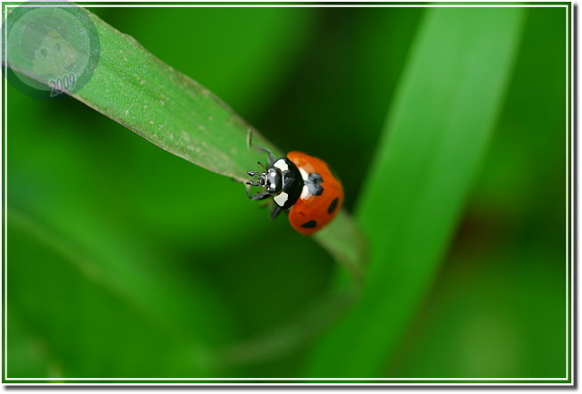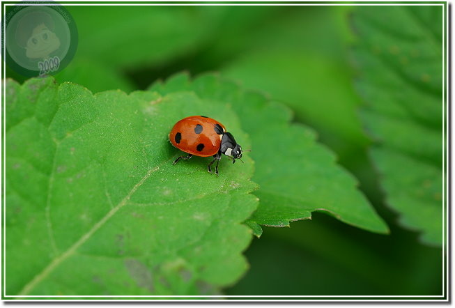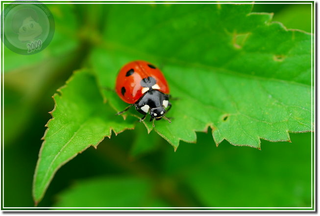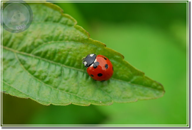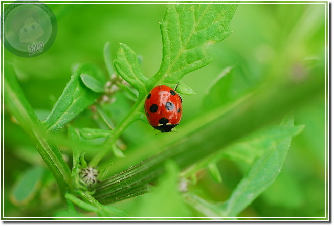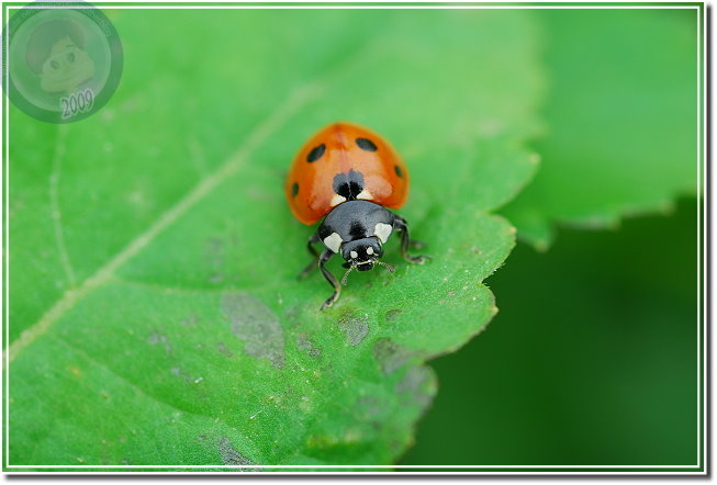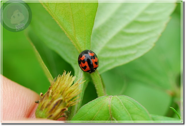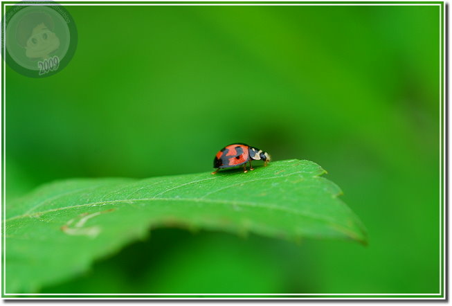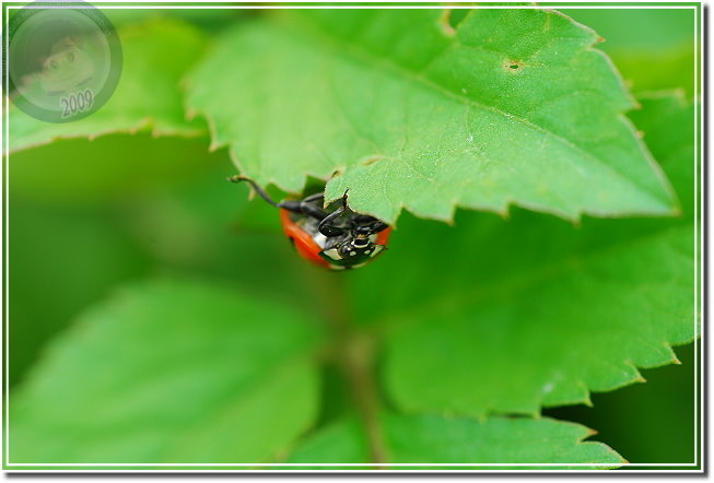 注意到六條瓢蟲之後,發覺玉米旁的大花咸豐草叢有多得數不清的瓢蟲,有六條瓢蟲,還有戴著一張滑稽小丑臉的七星瓢蟲。相較起來六條瓢蟲生性緊張,通常只能順利地拍到第一張照片,快門「喀拉!喀啦!」,一下子就把瓢蟲都趕到葉背,只能取「猶抱琵琶半遮面」或者「逃之夭夭的圓屁股」而已。戴著大花臉的七星瓢蟲則仗著大花臉與背上的七星,老神在在、慢條斯理地嫌晃,了不起在我多貪按幾次快門觸動到葉片的時候定住不動。