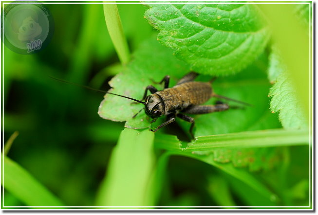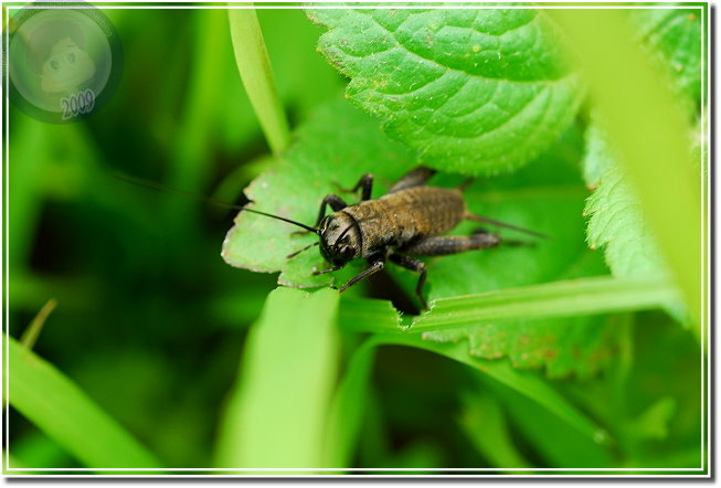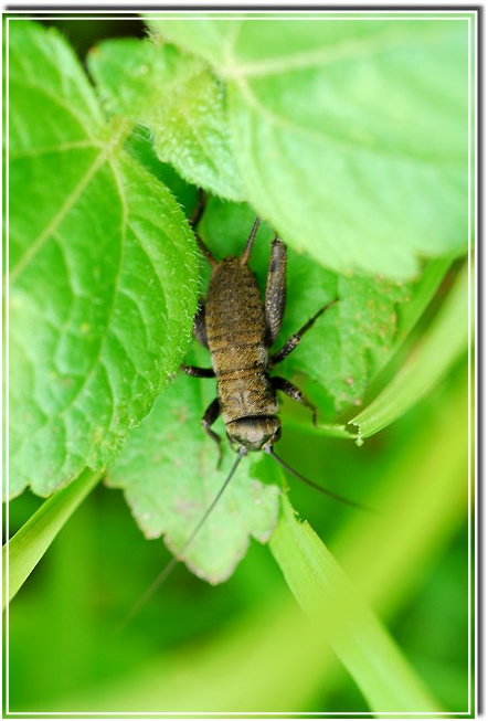 就在「瓢蟲觀賞區」下方,還有隻眉紋蟋蟀正用著早餐,我很訝異他絲毫沒被我的腳步驚擾,依然啃著青葉大餐。看來老婆婆除了節省買水瓢的錢,順道也省了農藥錢,所以她賺了硬朗的健康,也賺了滿園為她清理芽蟲的園丁。