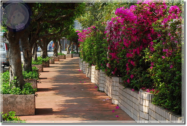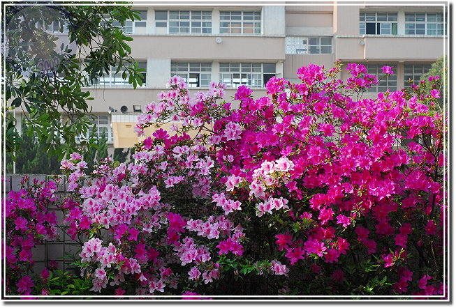 「淡淡的三月天,杜鵑花開在山坡上,杜鵑花開在小溪畔,多美麗...」幾任老闆的努力,學校內、外一到三月就開滿杜鵑花。雨水多的時候,花就像風漬書一樣,蘊含風華卻少了賣相;幸好,今年杜鵑花含苞時遇乾旱,花一齊綻放,儼然形成小小杜鵑花城。