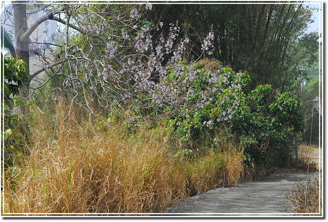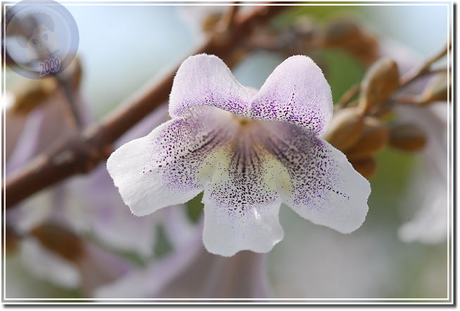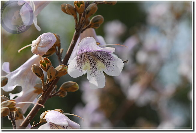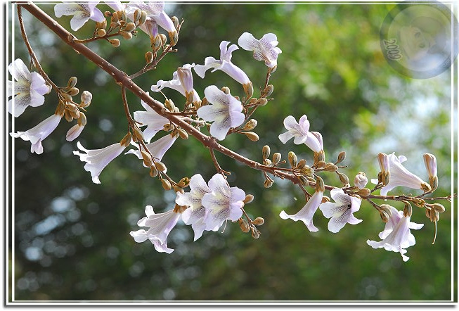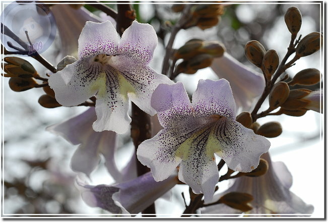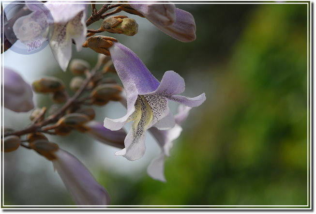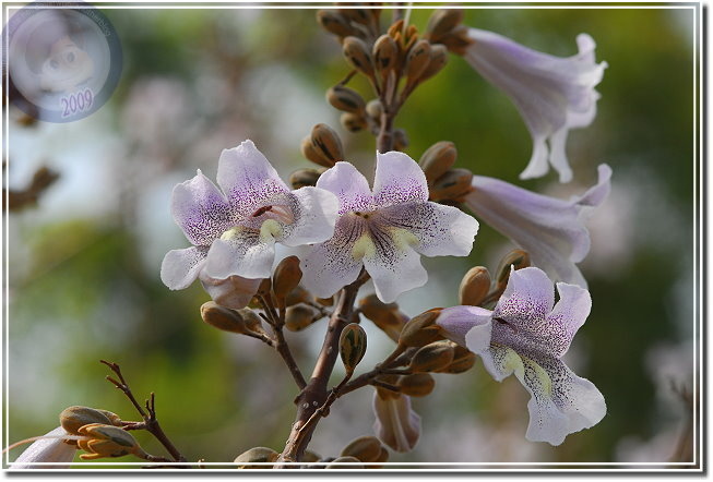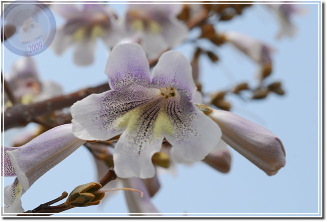 終於這星期接獲花訊,且也得知樹名為「泡桐」,唯恐花不經開,利用中午休息快去快回,遺憾的是匆匆來去,一來光線不對;二來不能細細地玩味。在一般園藝的花卉圖鑑沒發現「泡桐」,用網路搜尋一下,乖乖...原來泡桐是頻臨絕種的植物,其實他就是梧桐,與油桐不同科,屬於玄參科泡桐屬。泡桐四月間盛開淡紫色花,然後始長葉子,花呈鐘形有點像大型毛地黃,花序則成串地朝天舉起。