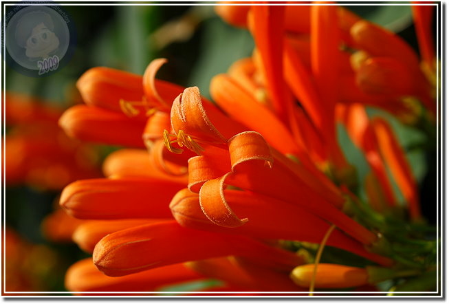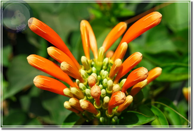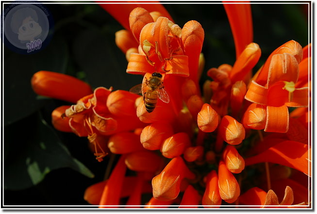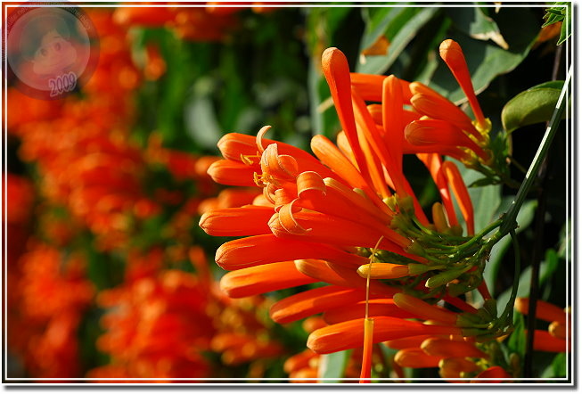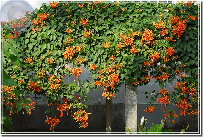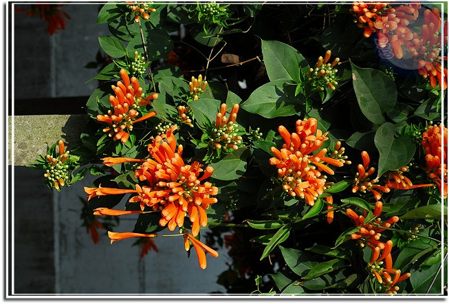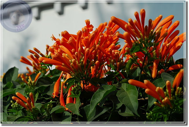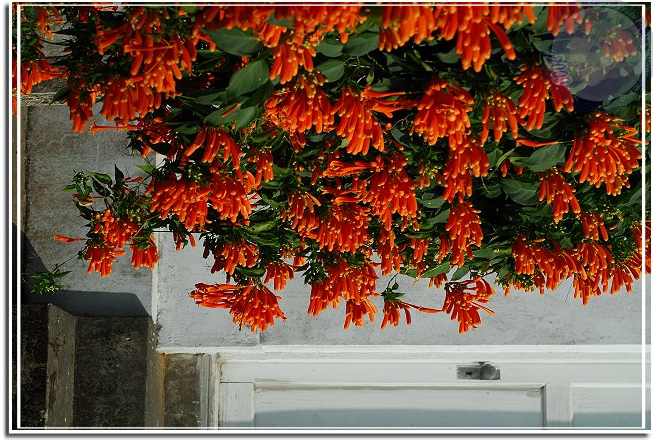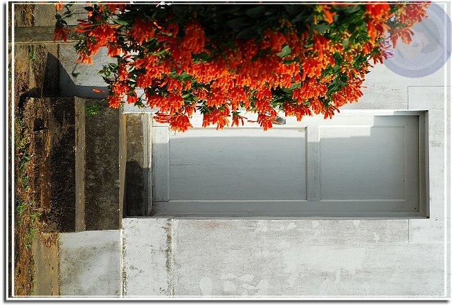 還在過年期間,所以炮仗花開也算是春節應景。炮仗花綻放熱鬧異常,常常很快地就攻陷整片牆,若是不小心讓她攀上屋頂,這時節就只能忍受「橘紅屋頂」了。年初開始到處問:「炮仗花開了沒有?」沒想到才幾天各角落的花兒一一現身。毘盧寺的炮仗花不是開得最豔麗,就在寺後方小小的篷架上攀著,但是配合後方的白牆、門,讓炮仗花的橘因為對比而更加動人。