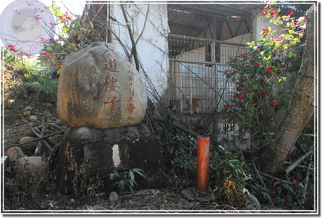 好不容易到了寮斗山登山口,另一邊就是萬里長城入口「八道樓子」碑,無論如何總是要停下來拍張「到此一遊」。回首剛剛經過的彎道,樹縫之間似乎可以鳥瞰豐原市,但沒有力氣回頭了,如果往下...我也沒把握是不是有力氣再回頭。萬里長城這裡看來已經荒廢許久,大概少有人會到這裡登山吧。