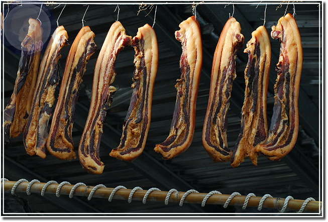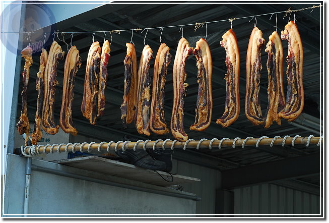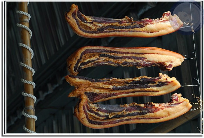 小時候好像家裡不曾這麼醃過豬肉,套一句媽媽的話:「生吃都不夠了,哪還能晒乾」。後來有能力醃豬肉,一家子人卻全都吃齋念佛去了,只留下我對著鄰居竹竿上醃豬肉流口水。
