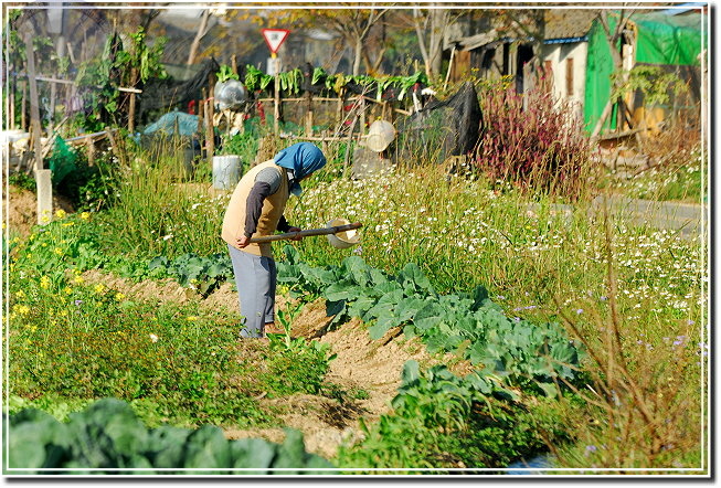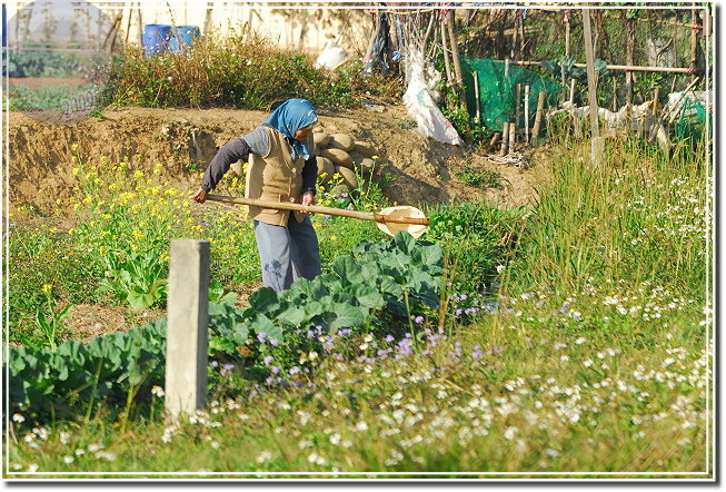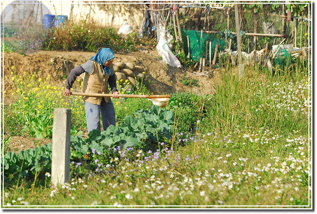 從開始騎腳踏車就注意這阿婆了,傴僂的很引人注目,夏季裡,一身短衫、花白的頭髮;到冬天,包著頭巾應付當地特有的強風,也加了背心與袖套。唯一相同的是手裡那竹勺子,老人家節儉地在竹子頭上綁著工程帽瓜代,這也是我頭次注意到他的原因。這一天為了拍小麥停了下來,準備上車之際,發現他利用陽光依舊溫暖的午後正用著他的勺子澆菜。
