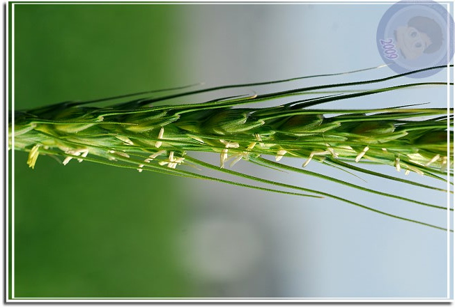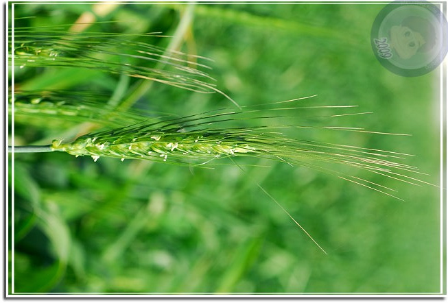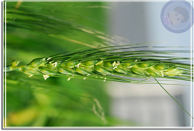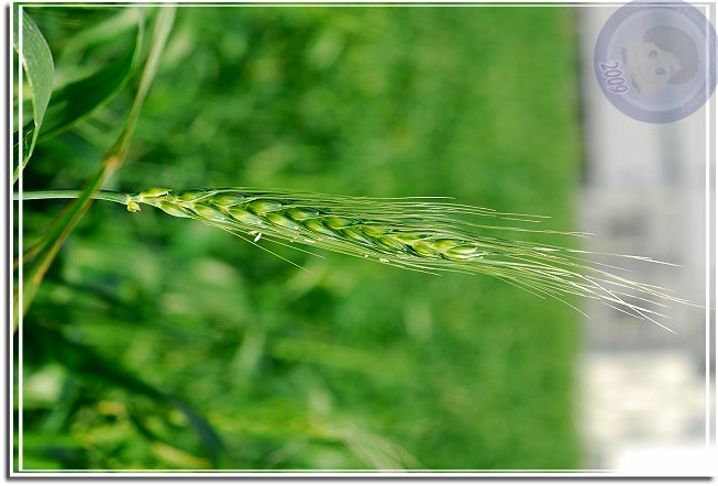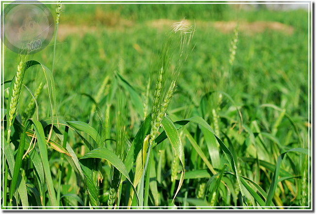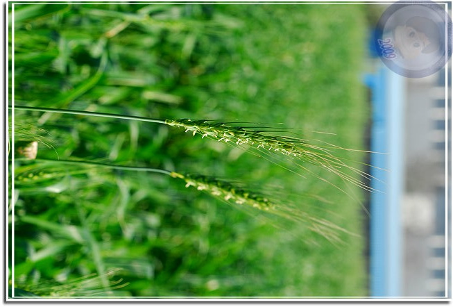 另外一片前幾星期忽然變成綠油油的,植物看起來像草,但又整齊得過份,絕不是偶然飄過來的種子所能造成的景觀。終於,今天經過的時候他已經抽穗了,長長的麥芒夾著白色麥花解了心中的疑惑。