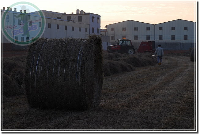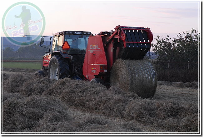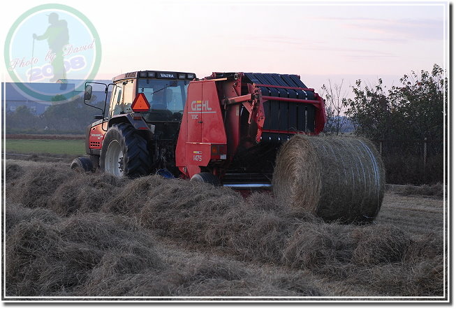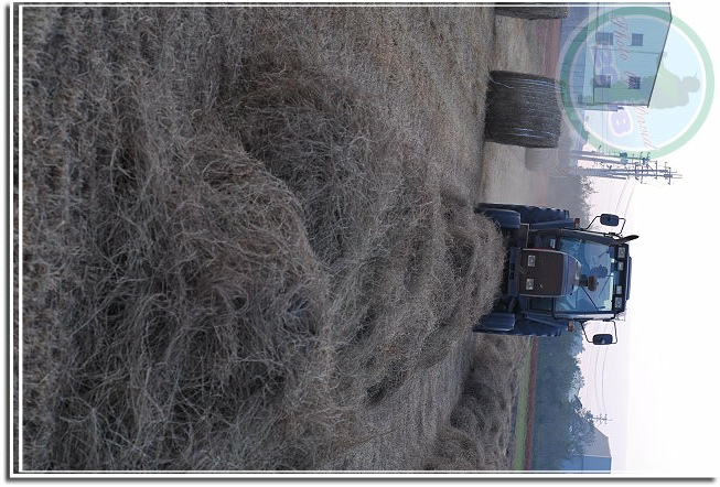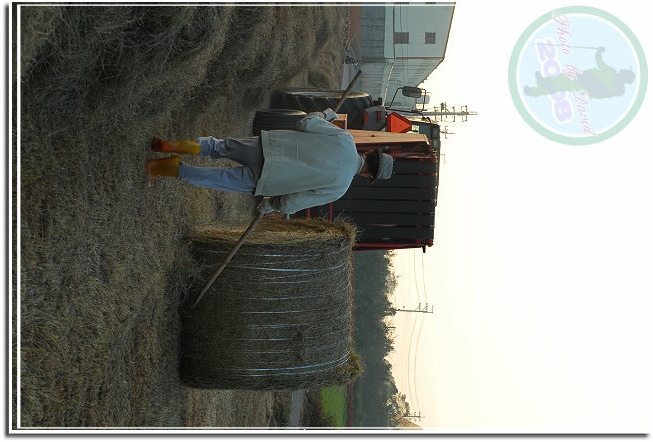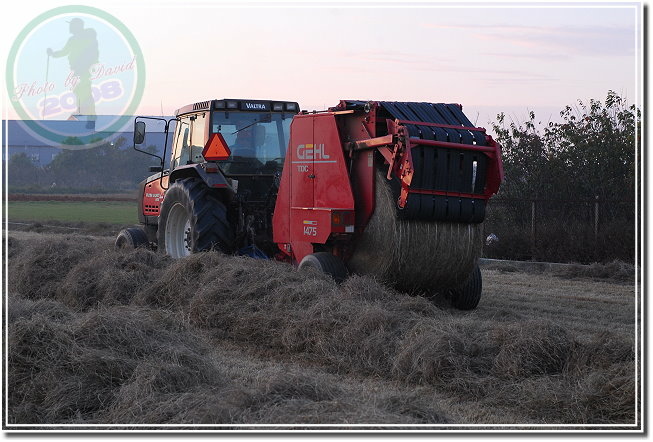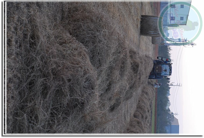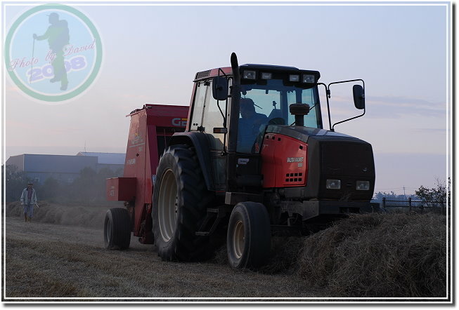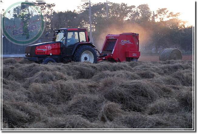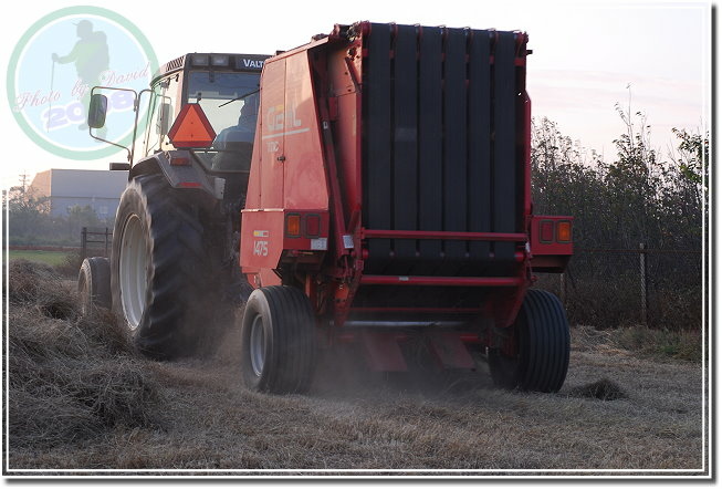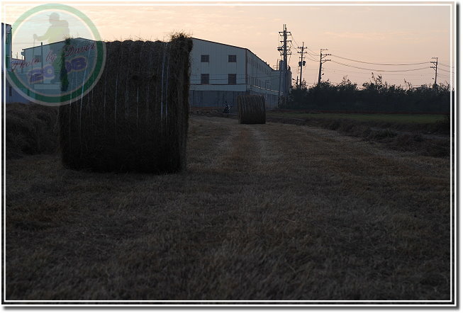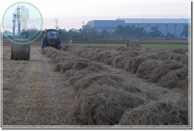 而最幸運的是遇上不預期的事物:我相信很多人沒在中部見過這捲牧草的農事。牽引機就拉著後頭這個神奇的小拖車,像是收割稻米一樣繞著牧草田轉圈圈。牧草先鑽過拖拉機的胯下,轟隆轟隆地被神奇小車吞下去,逆光中農夫與她們忙得塵土飛揚。吃著吃著,吃撐了拖拉機就停住,然後「匡蹚!」神奇小車就翹起屁股將扎得緊實的草捲給吐到田裡。