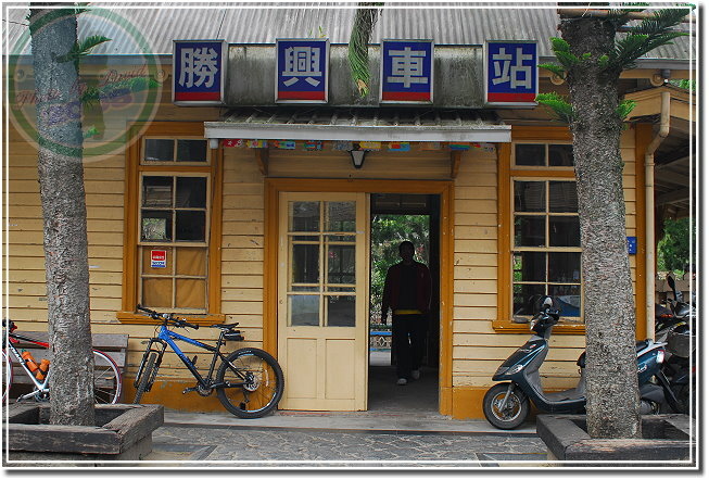 一進到勝興村,疲累都被成就感取代。兩個人就坐在車站前面灌水、喝咖啡、吃粿...夠 kuso 吧!你能想像一身勁裝的騎士,左手端著咖啡、右手卻是艾草包嗎?
