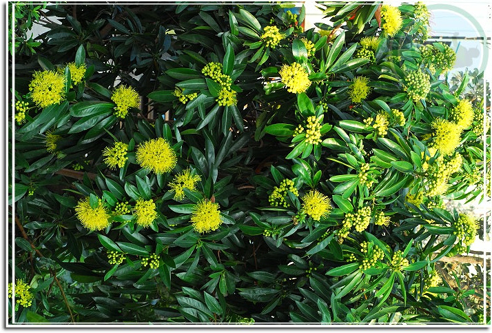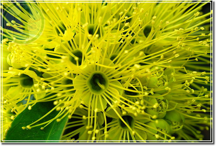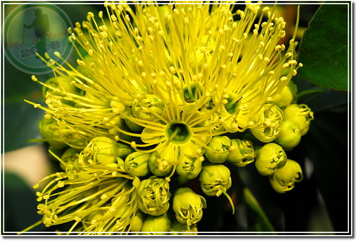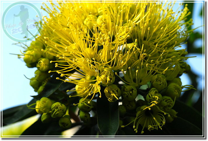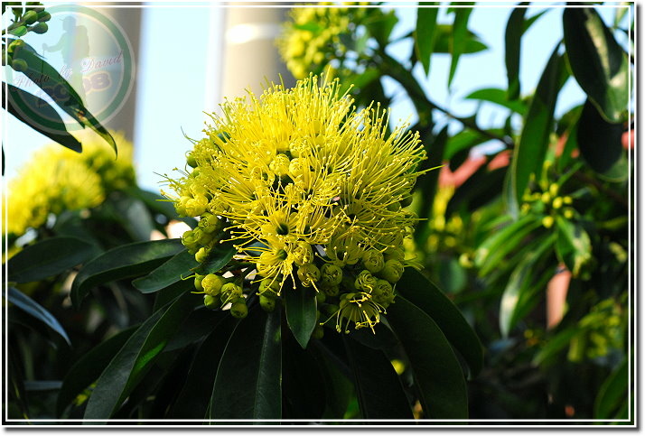 黃金蒲桃,1996年自馬來西亞引入,圖鑑上說春、夏之際開花,卻又有網友說秋天為花旗。今天看見,或者要說「眼見為憑」:她明明就在十月中旬的秋天綻放。樹高可達5公尺,葉對生、互生、叢生均有,聚撒花序,花金黃色。