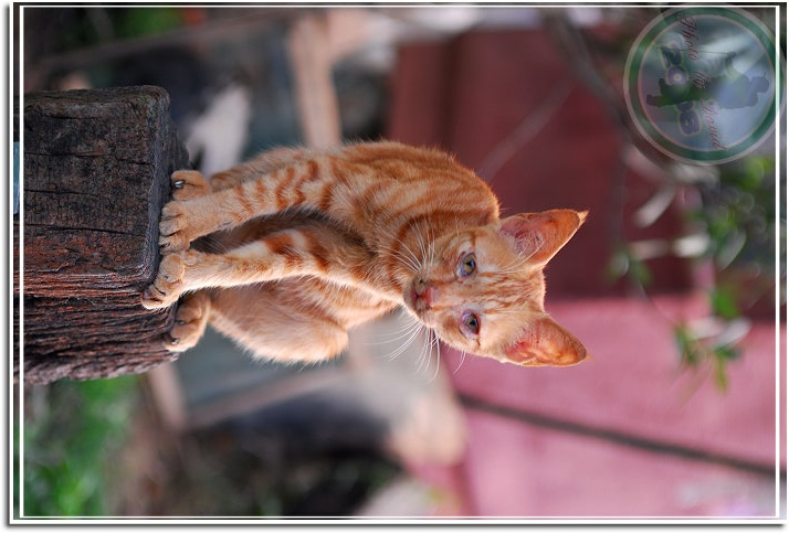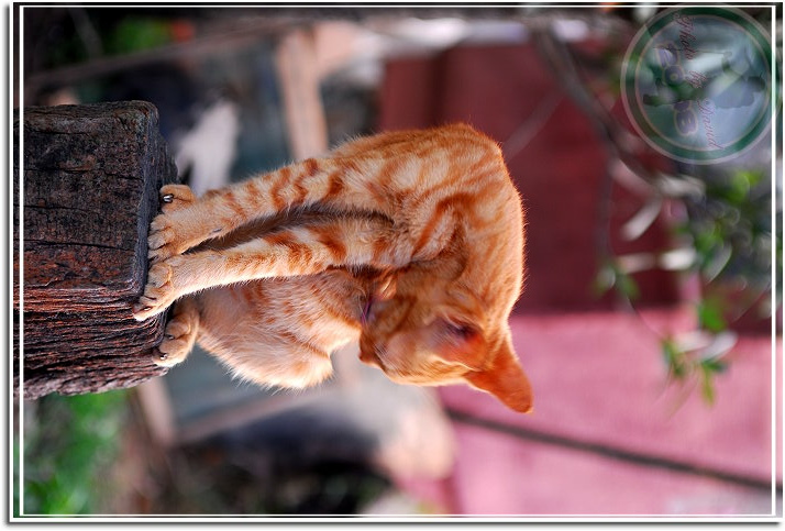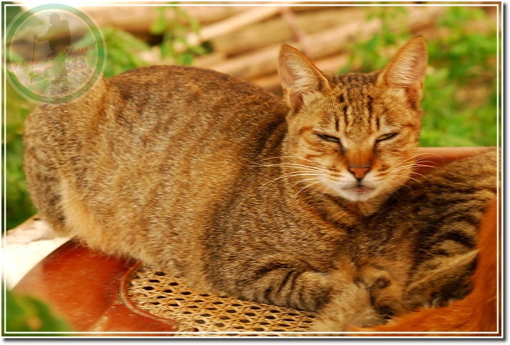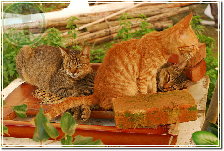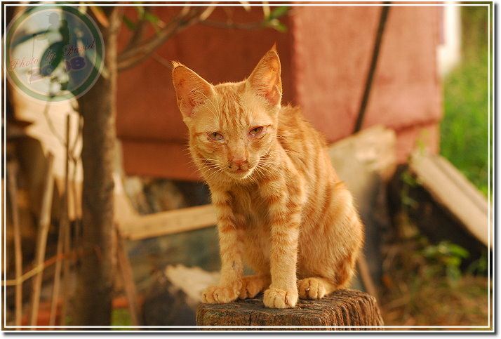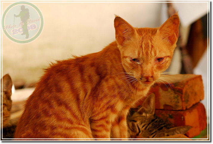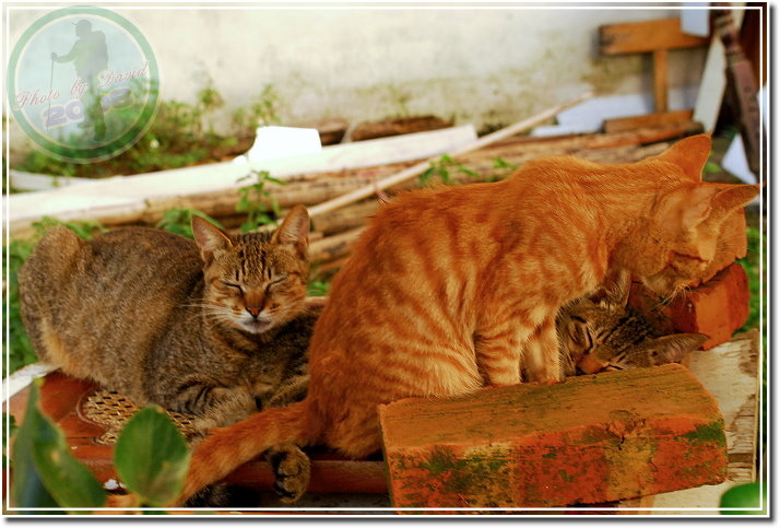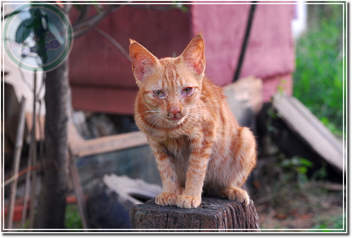 牠有點病態,瘦骨嶙峋、眼角佈滿眼屎,應該是隻不健康的貓。眷村後窗埋了一長排的枕木,而且一反常態矮矮地當作小籬,剛剛好讓小貓蹲坐在上面。我見到了還猶豫一下才回頭,剛開始牠轉頭理毛沒看見我,聽見快門聲音才猛地回頭。拍了幾張後牠終於受不了,跳過草地,也才發現還有兩隻貓臥在草叢裡的椅子。