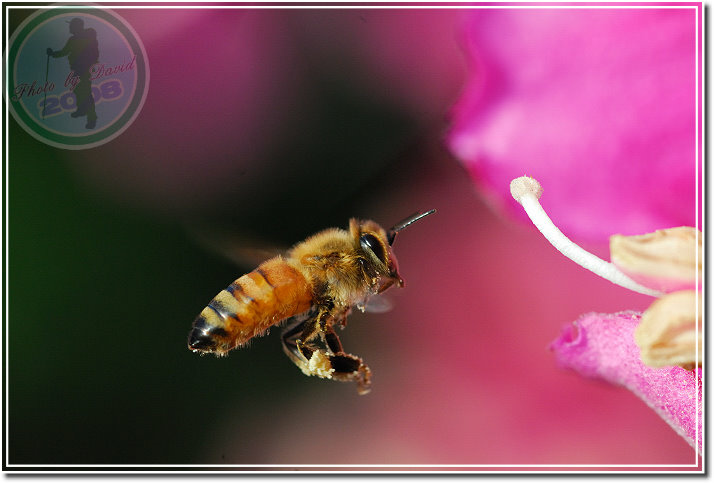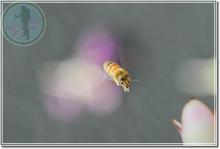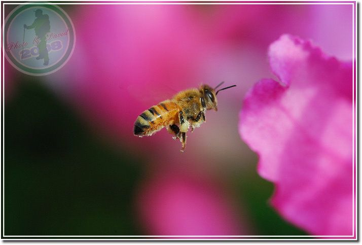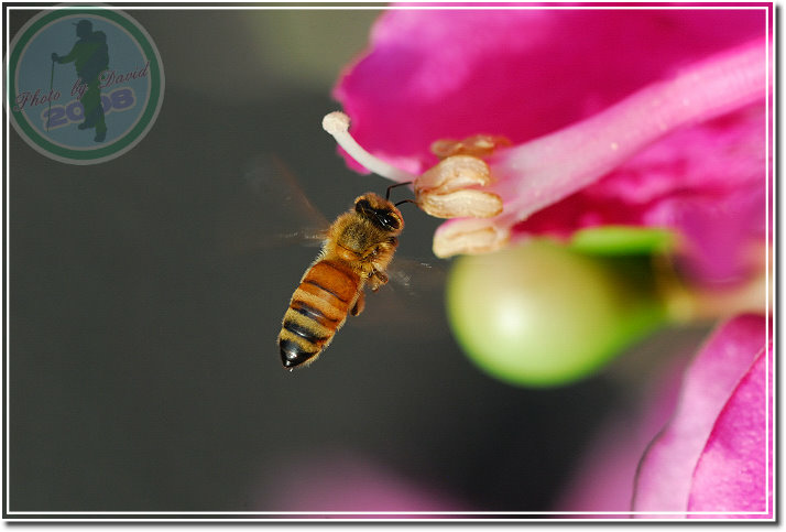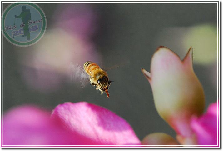美人樹除了艷麗地妝點庭園,還是熱鬧的「早餐店」。除了偶而發現花蠅、蚊子之外,蜜蜂算是最大客戶。前幾天用60mm,主要目的是為了拍花,想捕捉飛翔中的蜜蜂卻因為距離太近、視角太小,即使汗流浹背依舊拍不出令人滿意的畫面。尤其相機的螢幕不大,另方面懶得一一地檢視,等到將照片下載到電腦裡,才知道拍了一堆脫焦的照片。今天就算是「補交作業」吧!就用高感光度、高速快門凝住忙碌工作的蜜蜂。