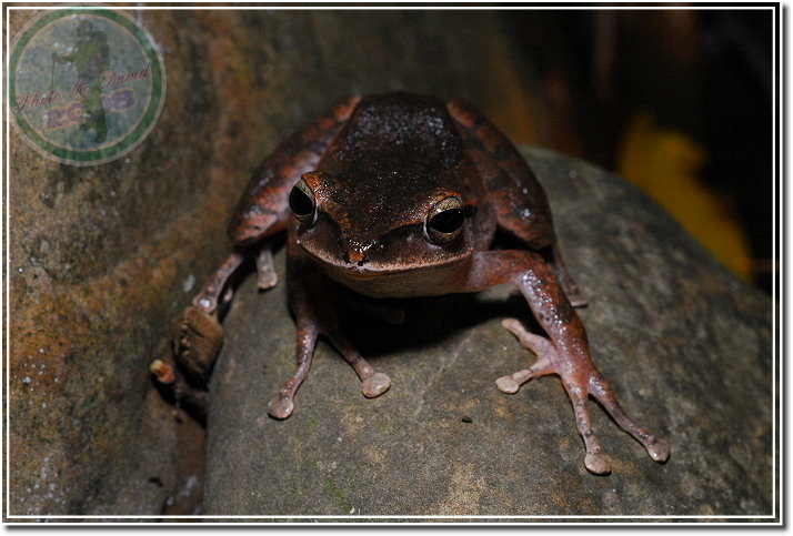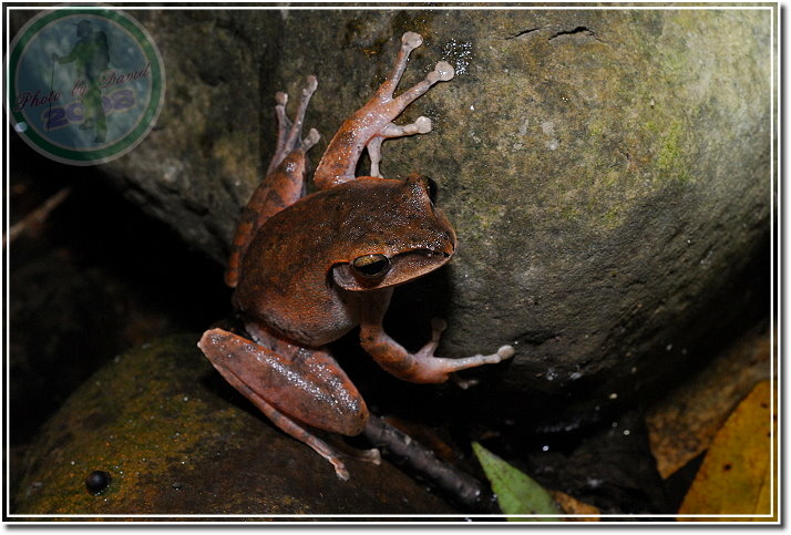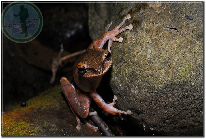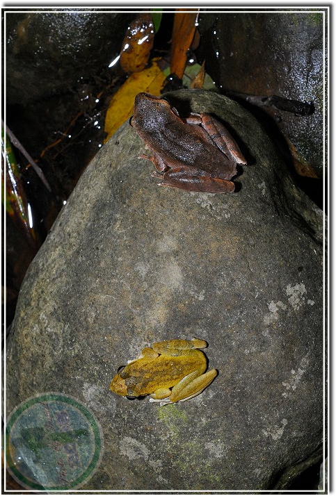 好大的褐樹蛙母蛙啊!再定睛一看,一旁的公蛙對她並不來電,將頭轉向黑暗的溪流。原來她不是褐樹蛙,而是隻碩大的「白頷樹蛙」母蛙。相較褐樹蛙母蛙的機靈,白頷樹蛙有點傻大個的感覺,我不斷地轉換角度拍照,牠就面無表情地趴的,也沒有任何閃躲、迴避的動作。直到我拍夠了,覺得牠擺的姿勢重複太多,輕輕拍拍牠的臀部,提醒他該走了...這才「噗通!」地跳入黑暗的深潭裡。
