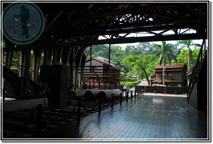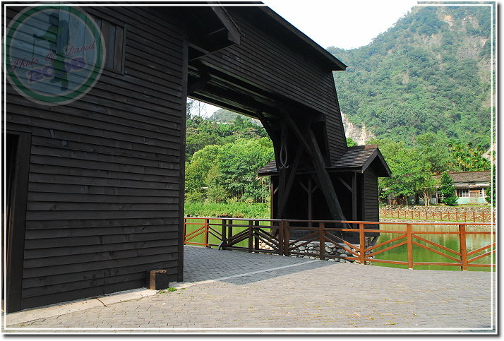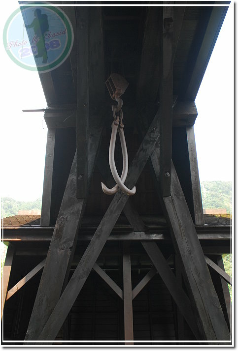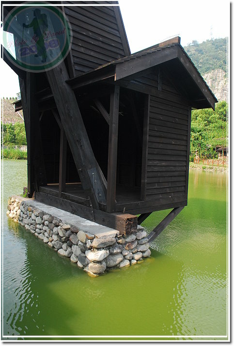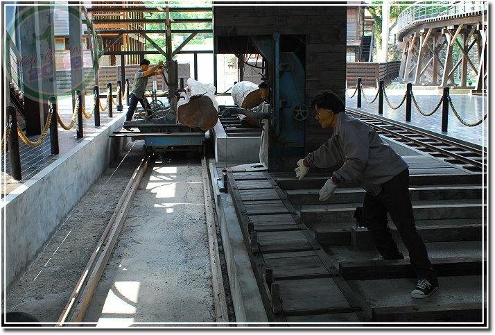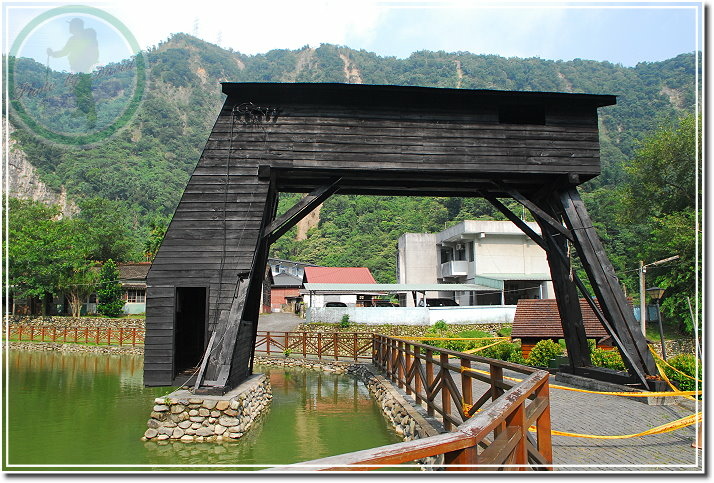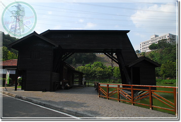參觀完館內設施,由另一端出口可以走上蓄木池。對蓄木池一點也不陌生,小時候住在大甲林區管理處裡,就有一個巨大的貯木池,範圍包括現在的的台中縣政府與對面的停車場。早期八仙山林場還在砍伐林木,原木也會由柴車載運到林場,柴車就在池邊的水泥護堤上讓原木鬆綁、滾落水中濺起大水花。而卸下原木的地方就有一台和照片中神似的木造建築,直到今天我才明白那就是「天車」(起重機)。