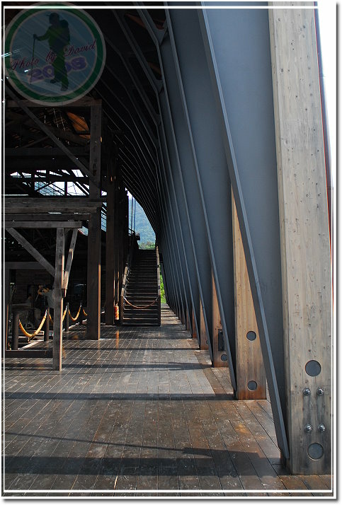進門就是長長的木造結構之意象迴廊,右邊還有車埕火車站連結過來的運材鐵道。館外人潮鼎沸,但館內卻冷冷清清,大概是見我走進來了,幾分鐘前還在候車室聊天的解說員才慢慢踱進來。