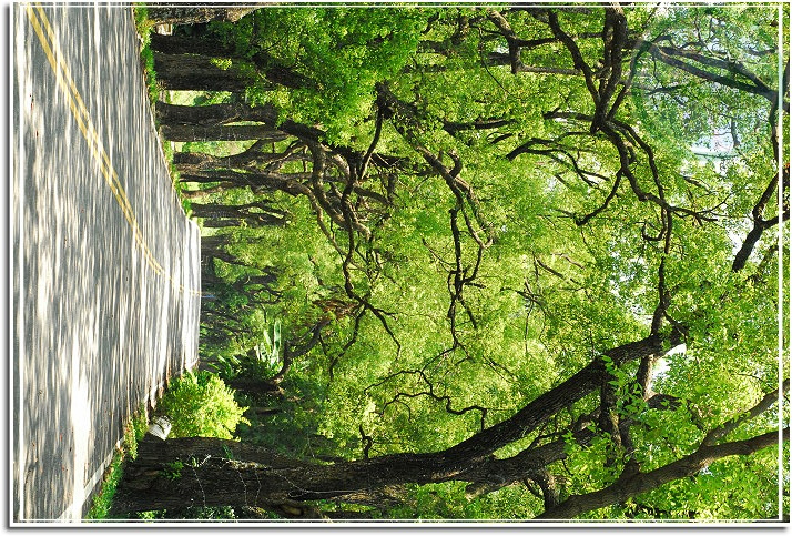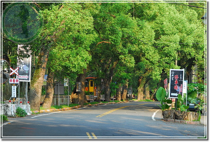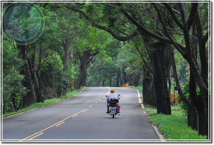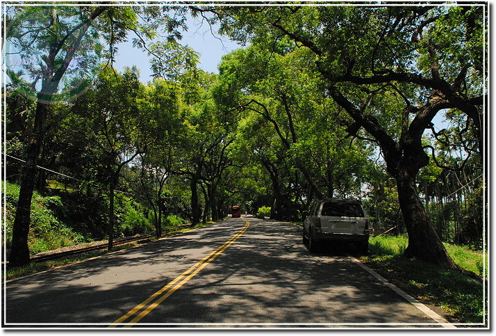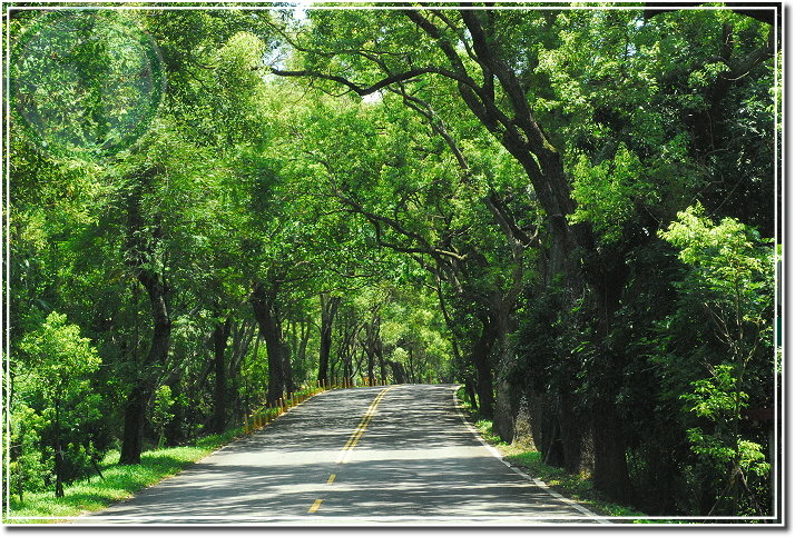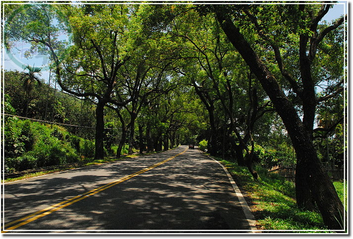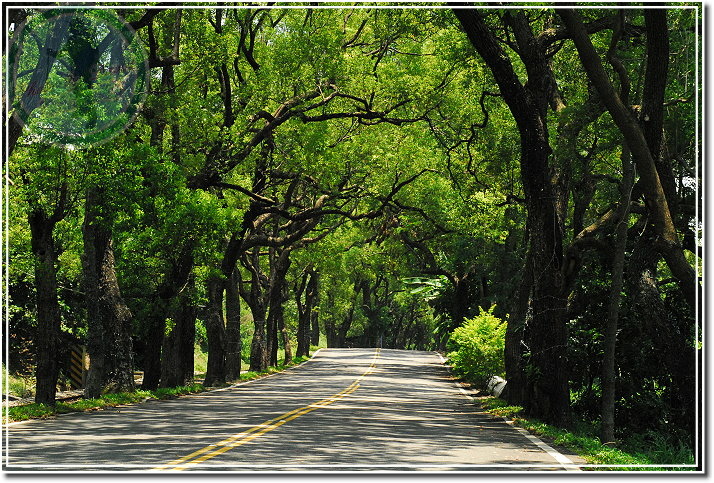 「樟樹」是綠色隧道的主要樹種,葉子在陽光照射下呈現特殊的翠綠。同時也因為兩旁的樹已經拱合,艷陽下還是感覺到蔭涼,尤其配合樹影烙上柏油路面。不知道你有沒有感覺?最美的綠色隧道往往出現在開車的時候,等停車抓起相機,剛剛的「美」一溜煙就不見了。也許該用走的?但能走在路中間嗎?或許最好的角度都被安排在雙黃線上。