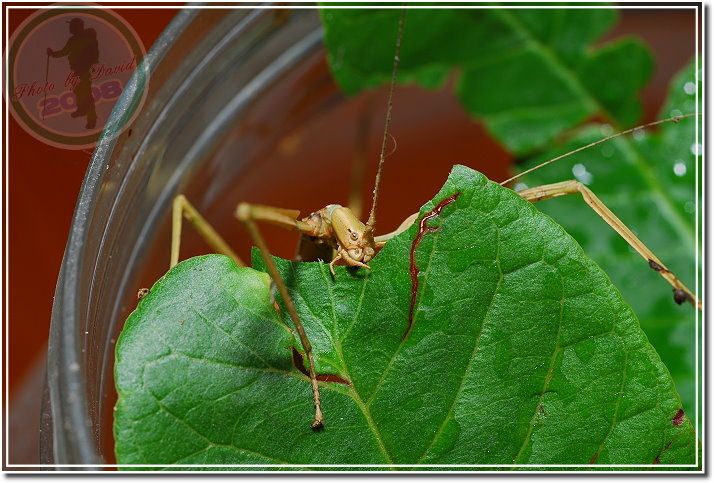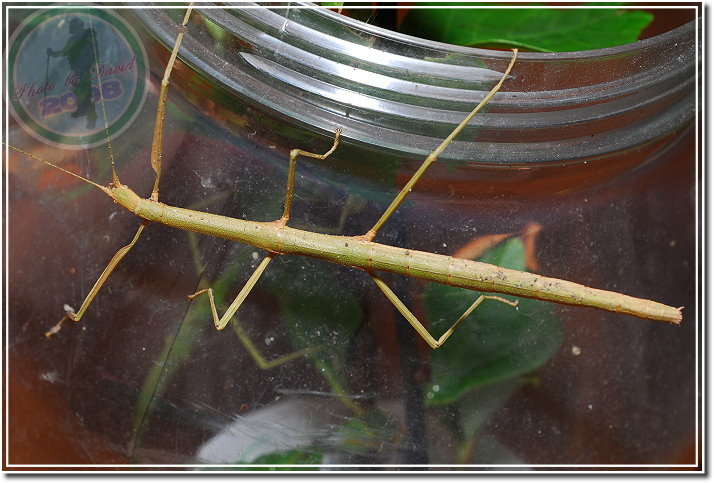 剛帶回來,牠們有點害羞不願意進食,擺了兩天之後,不經意地用電風扇吹到牠們,竟然就搖搖晃晃地開始進食。竹節蟲會模擬樹枝被風吹微微的晃動,但受到驚擾的時候也會發足以極快的速度狂奔。平常,我會用蓋子虛掩住,因為牠們會趁著四下無人處爬,以前曾經發生過不知所蹤的例子。這兩隻也曾經爬到落地窗前倚門而望,只是外面麻雀、白頭翁為數眾多,時在不敢讓牠們在外頭的芭樂樹上自由生活。我在書房的時候就會把蓋子打開、噴噴水,噴到水的竹節蟲活力無窮,爬上罐子口緣「呼吸新鮮空氣」,吃完葉子、喝完水,就繞著口緣走。我發現罐子太高,所以六肢健全那隻會用後腳勾住後懸垂,但不敢往下走,光滑的罐子讓他找不到施力點。另一隻剩三隻腳,應該是道路邊坡除草的時候受傷了,或是曾經遇到天敵。牠就常常掛不住,啪地就跌到地板上。
