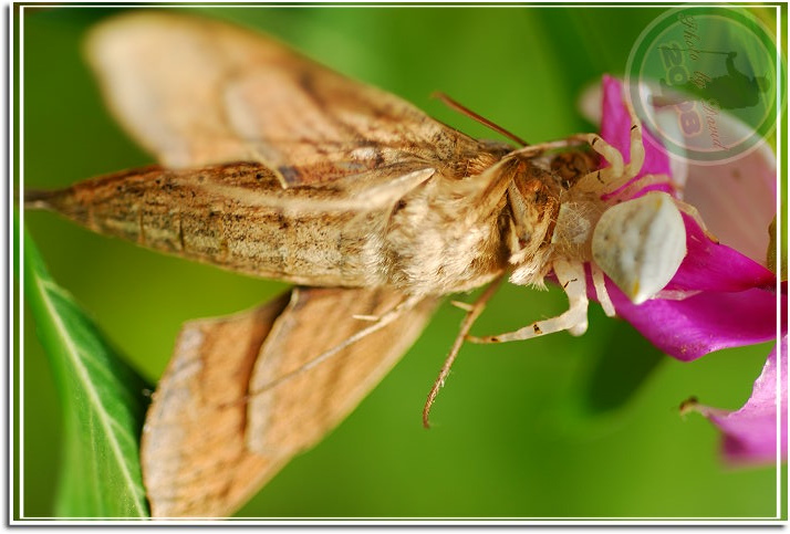轉了角度以後才發現牠已經是三角蟹蛛的囊中物了,蟹蛛擅長躲在花朵後方,趁著昆蟲前來採蜜時偷襲。不過,這次體形懸殊太大了吧,天蛾只要稍作掙扎應該可以脫困。我猜,這隻天蛾大概是由地上才剛羽化,爬上日日春準備等待陽光將翅膀晒乾就振翅高飛,就在還不能自由活動時倒楣地遇上這隻三角蟹蛛。