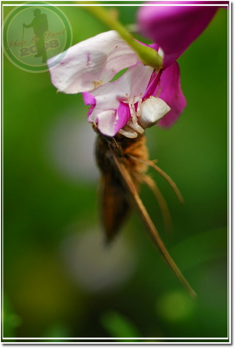 蟹蛛咬著天蛾的頭部,可能要花三天三夜才能吸完天蛾的體液。蟹蛛滿載而歸卻也必須付出一點代價,拖著沉重的天蛾,牠絲毫不能移動。當我翻轉牠站立的枝條求取更好的攝影角度時,牠也只能任我擺佈...除非放棄肥美的天蛾。