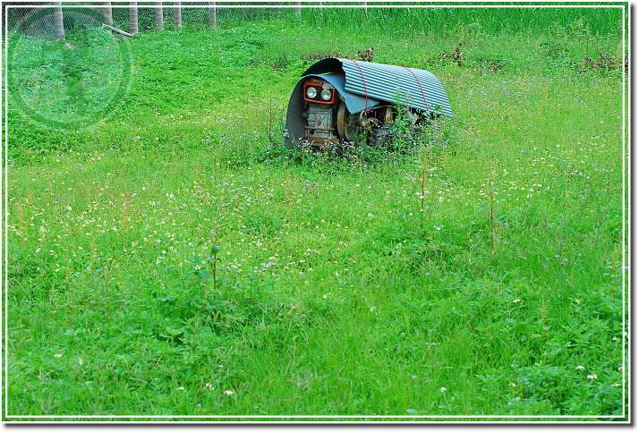 耕耘機休息了,主人用鐵皮、尼龍繩包裹之後停放在田中間。剛看見就想拍它,但始終未實現。直到週遭的草都長起來,並且在在春雨中翠綠,而耕耘機卻依然裹著遮蔽鵠立著。