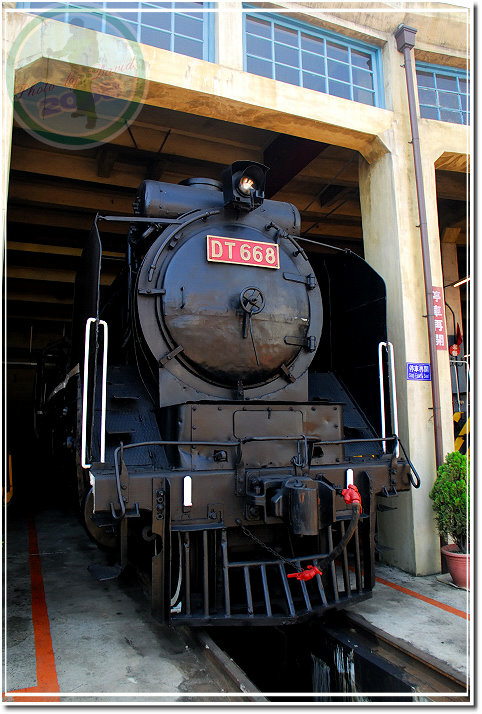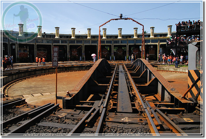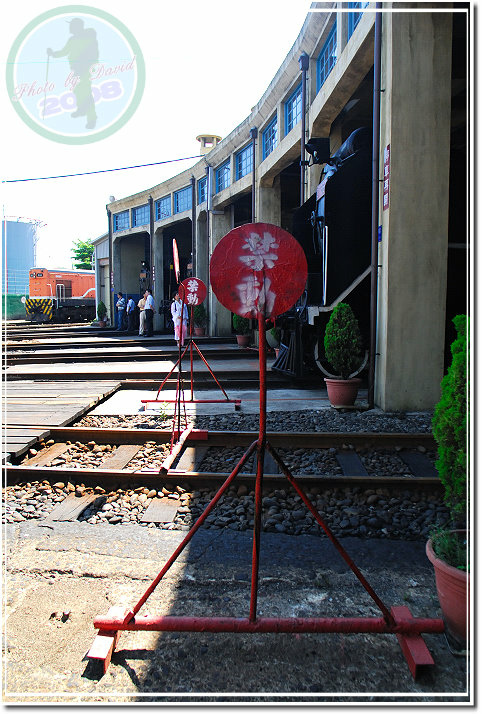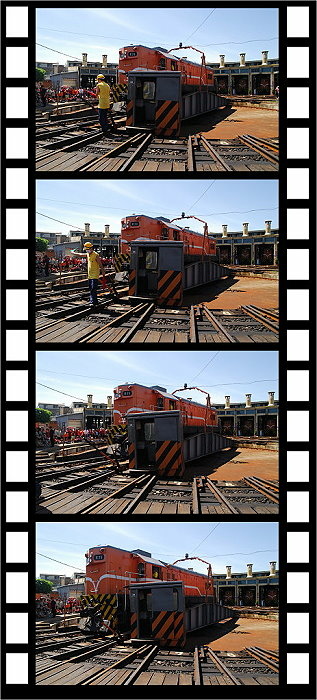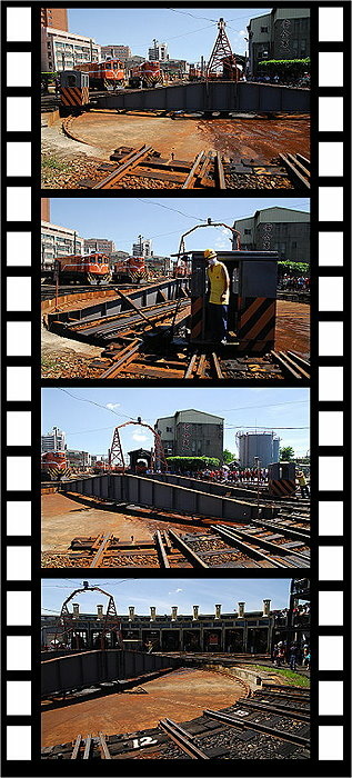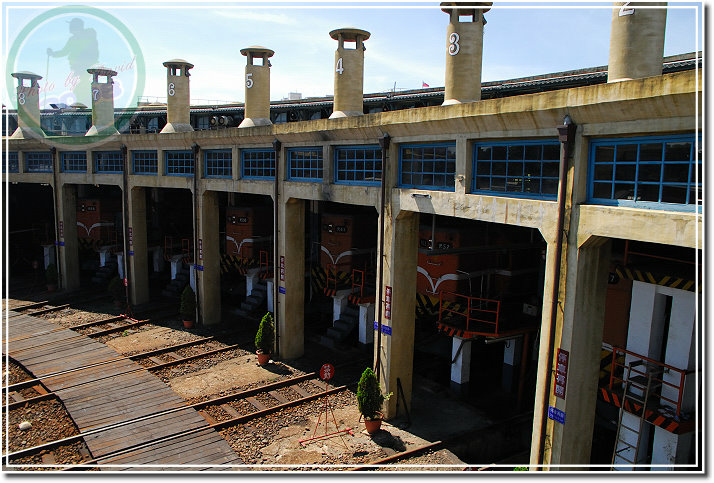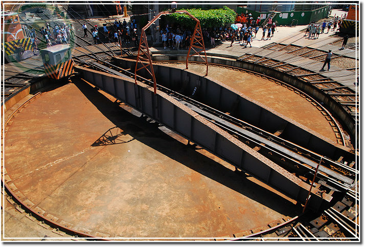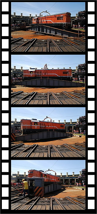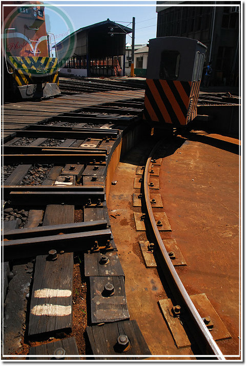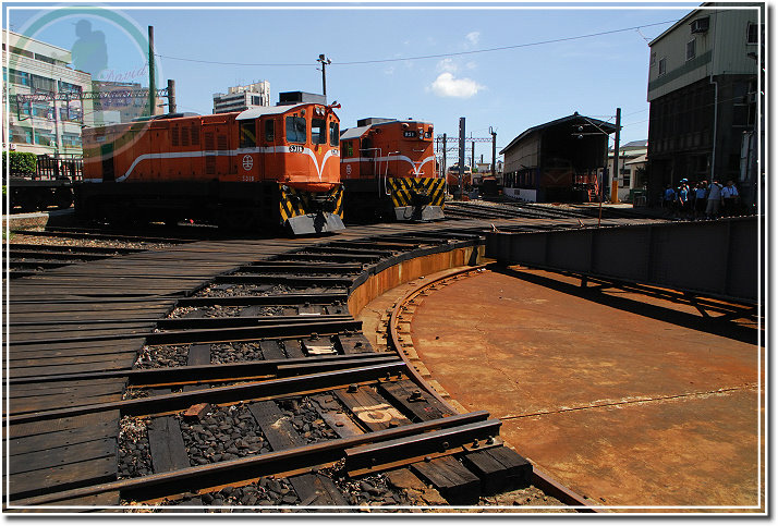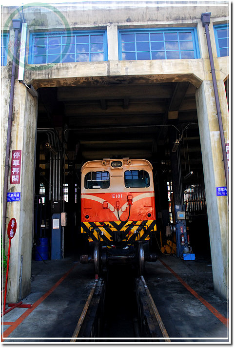 站在觀景台上可以看見 E1000 自強號由後方經過,頗有世代交替的感覺。當然來扇形車庫就是要觀賞調度的情形,在現場員工解說之後,也真的有一部柴油機車頭由車庫裡開上轉車台,秀了一段停車秀。機車頭開上轉車台時發出一聲巨響,頗有泰山壓頂之勢,真是充滿科技動力與歷史文化的美。