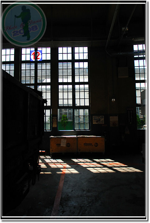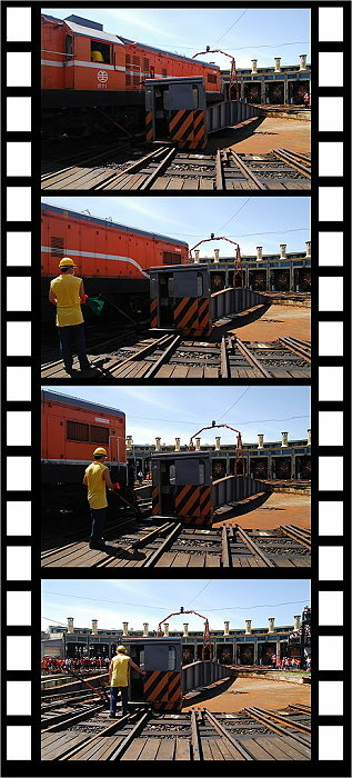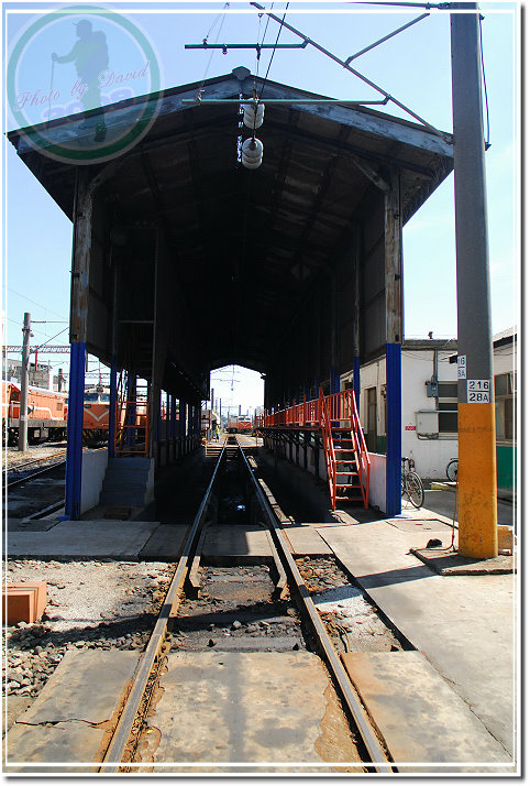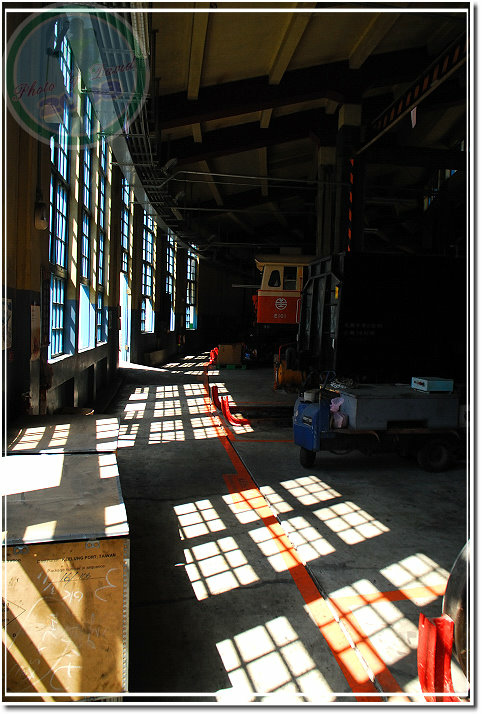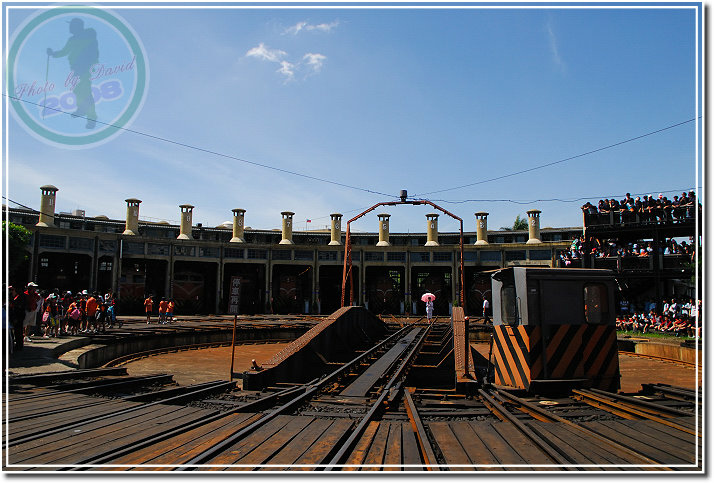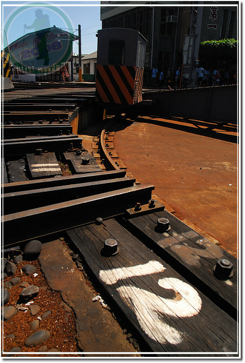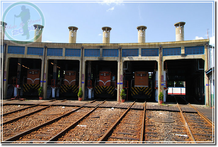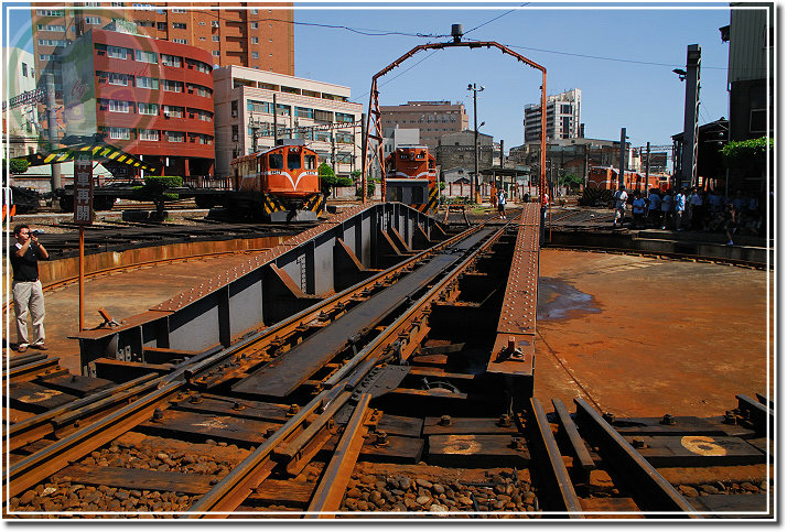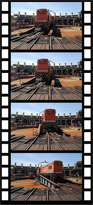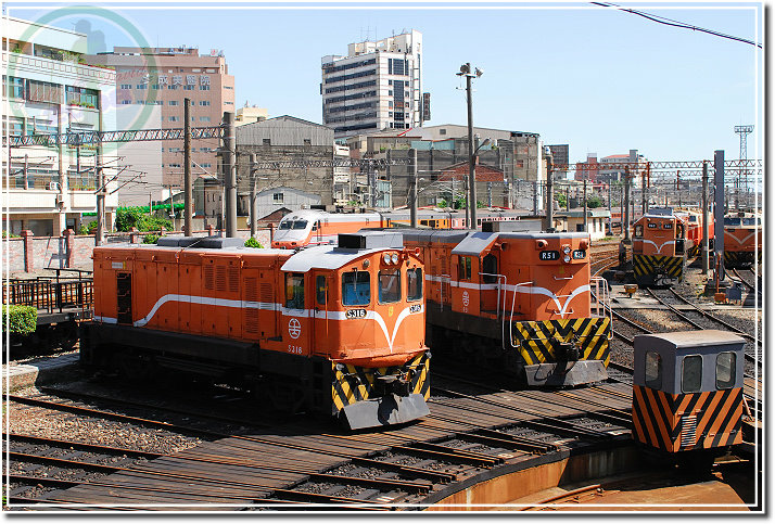 站在觀景台上可以看見 E1000 自強號由後方經過,頗有世代交替的感覺。當然來扇形車庫就是要觀賞調度的情形,在現場員工解說之後,也真的有一部柴油機車頭由車庫裡開上轉車台,秀了一段停車秀。機車頭開上轉車台時發出一聲巨響,頗有泰山壓頂之勢,真是充滿科技動力與歷史文化的美。