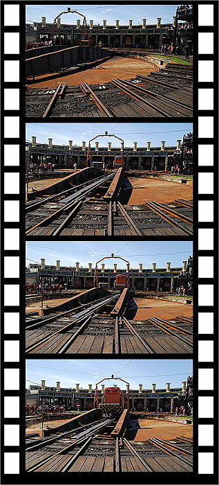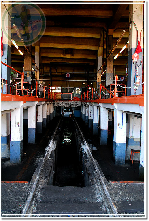 車庫有12組「股道」就環繞著可供360度旋轉的轉車架,列車由主線進入車庫會先到轉車架上,由操作人員以電力控制進入的股道,再停放到指定的位置。