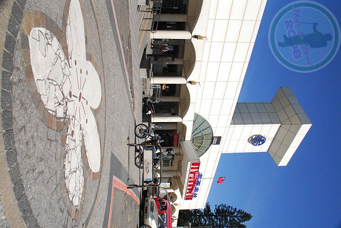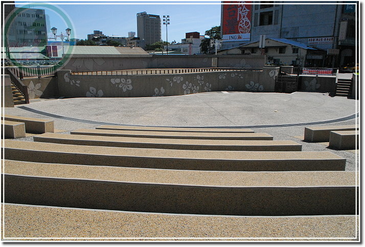 出了車站,站前廣場非常寬廣。可以看出苗栗站前廣場以「桐花」作為設計的主題元素,人行道有一朵石砌的桐花,花蕊有點草率,但大致上還是可以辨認。