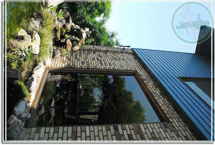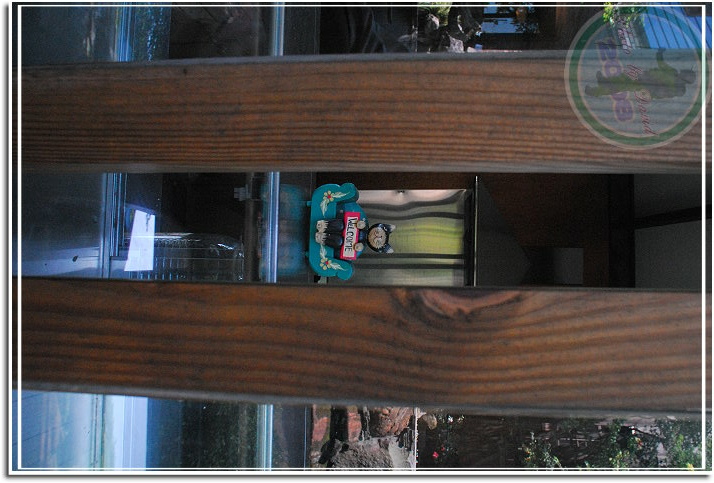 落地窗下有個「生態池」,再下頭養了好幾條三尺長的錦鯉,這生態池應該是為錦鯉濾水的淨水槽。但除了水草,還栽了紫色鳶尾,讓人一點都不懷疑是造景。