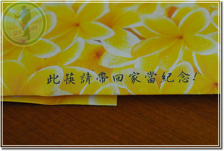 拿起筷子要用餐,包裝上透露出玄機。以黃色雞蛋花為底圖,俊秀書法的店名;翻過背面..「此筷請帶回家當紀念!」抽出筷子,好精緻的漆面處理,還在藍色印上「居鳩堂」。在背面還有一段文字: