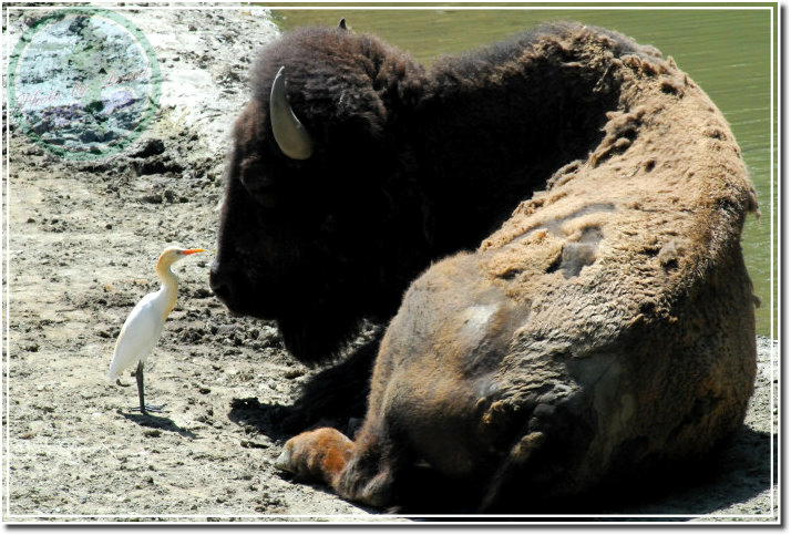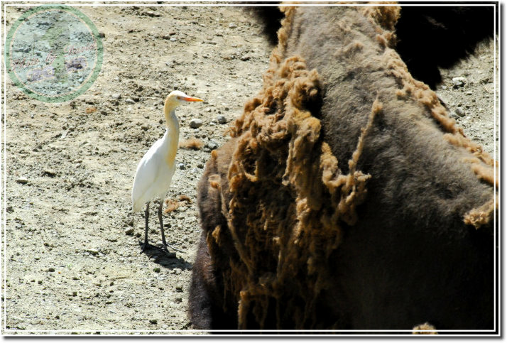 木柵動物園裡牠英雄無用武之地,大中午就窩在泥地上睡午覺。渾身毛茸茸的,如果沒洗澡大概很容易長寄生蟲,正成為牛背鷺覓食的好對象。兩種動物,一烏漆抹黑、碩大無比;另一則純白嬌小,形成強烈對比。算是另類的「東方遇見西方」嗎?