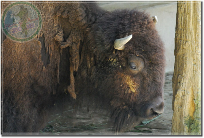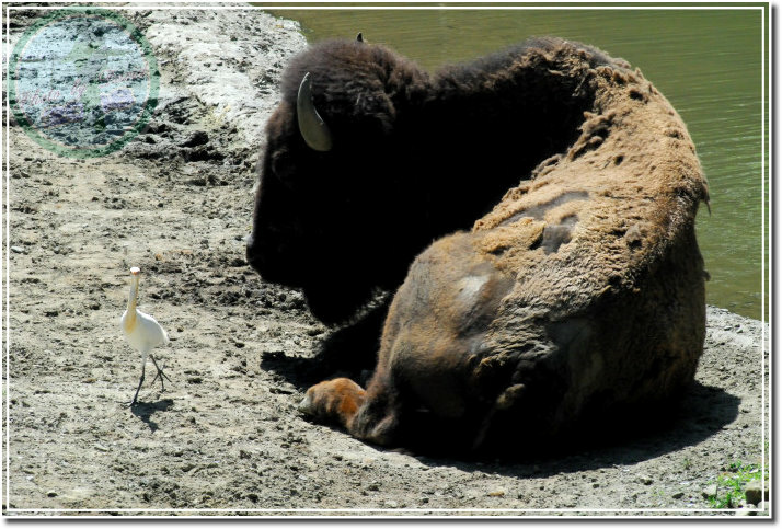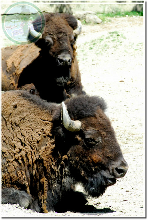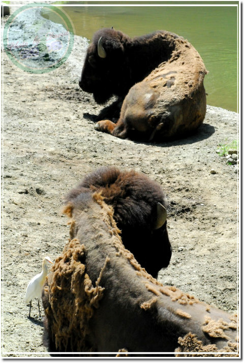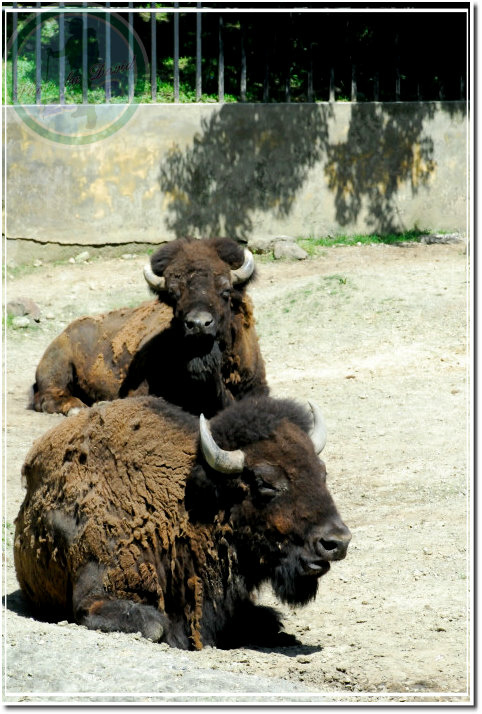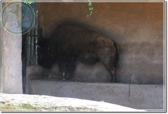 離開前,發現有隻美洲野牛躲到雨棚下,配上後方紅磚色的牆壁,像不像尼安德塔人的壁畫?