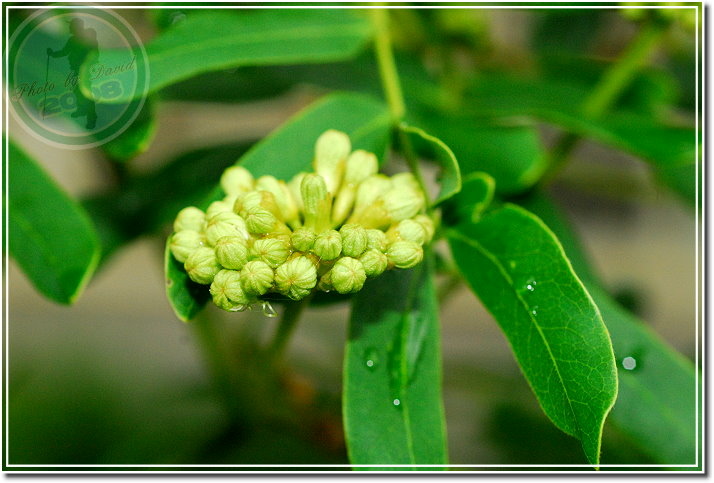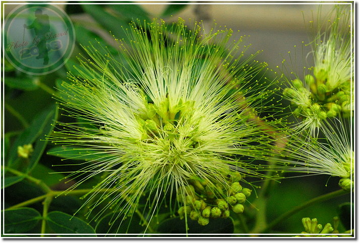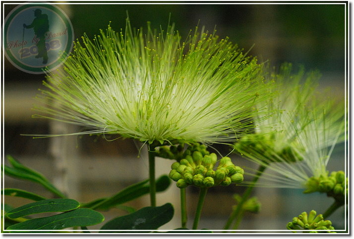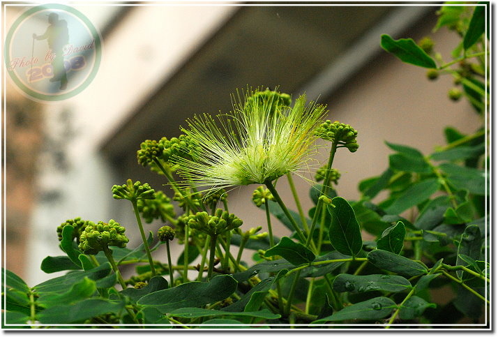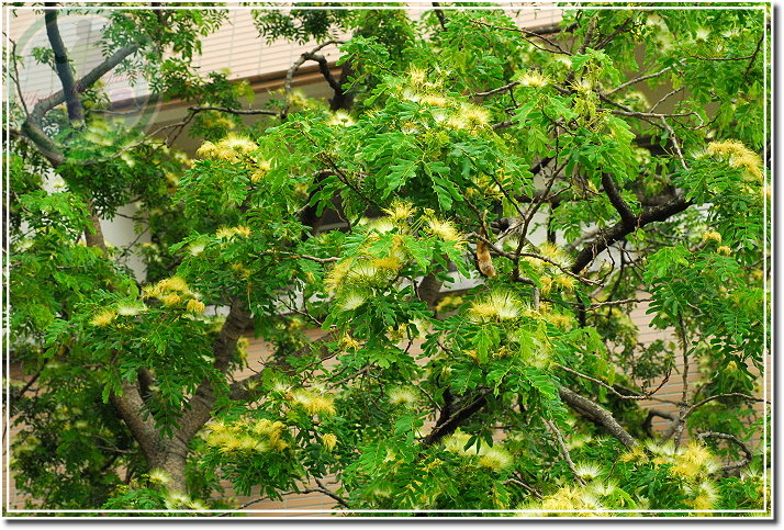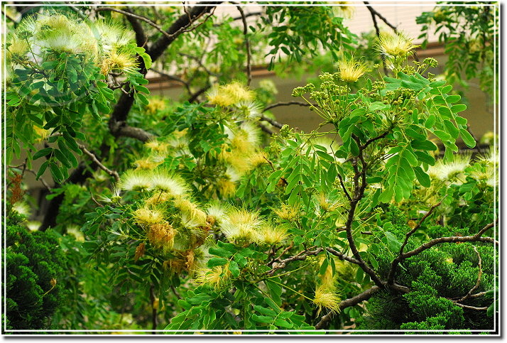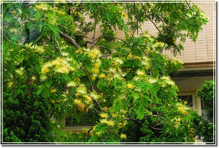 合歡開花了,在晨雨裡黃與白顯得特別濃郁。