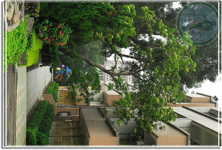 不明就裡的人會懷疑花台的坡坎到這兒怎轉了個彎?彎上還鑲塊工程碑,說不定還以為是留名碑上的人好大喜功。其實當初之所以讓坡坎轉了彎純粹考量植樹不易,植樹的人有心,維護樹木使之成蔭亦不簡單,當然不能因為工程而粗暴地砍除。所以建坡坎的人緬懷、感謝前人,細心地轉了彎留下這棵準時綻放的「合歡」。
