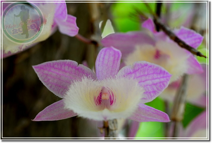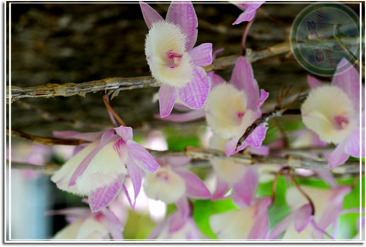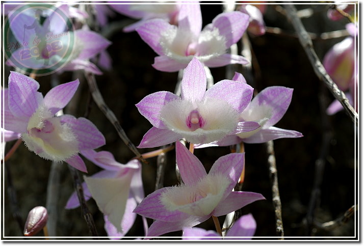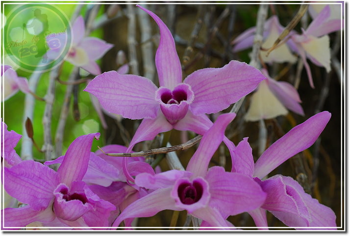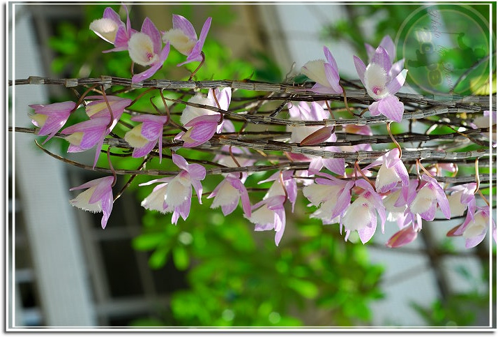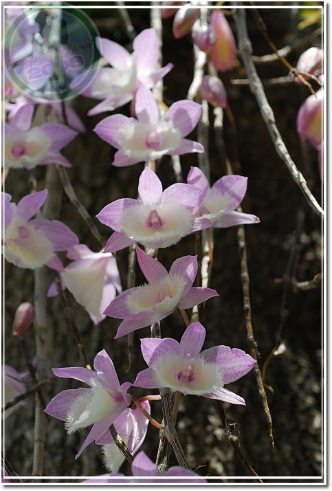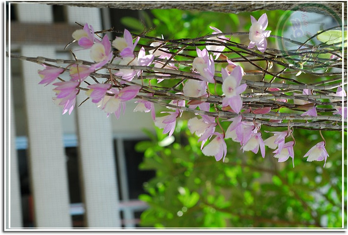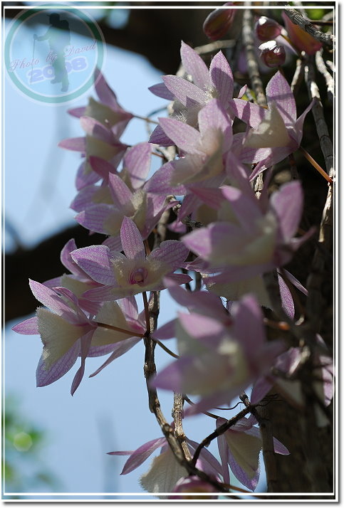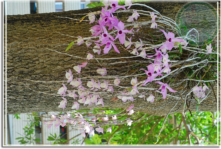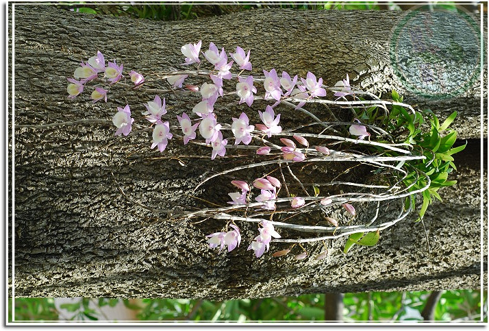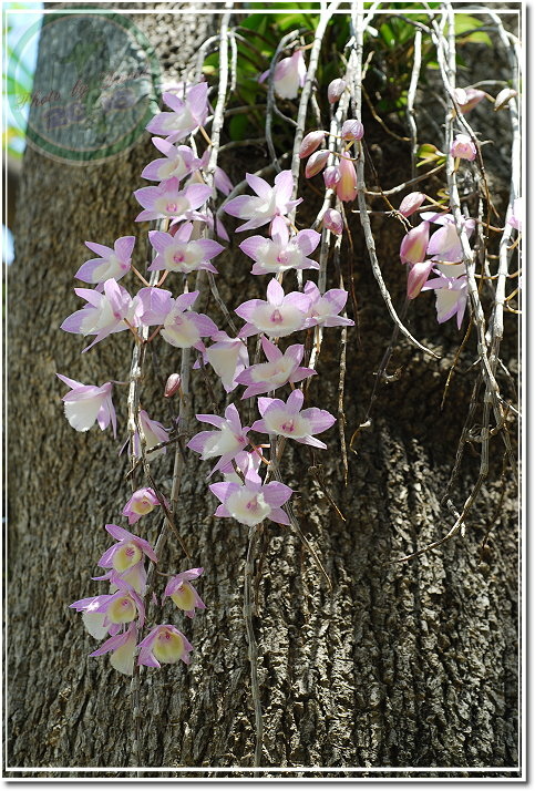 顏色較紫的是石斛蘭,粉白色的才是天宮石斛蘭。整理檔案看到去年拍攝的時間竟然相同的4月23日,這花還真準時地開。蘭花本來就著生林木上,所以我也將它種在黑板木的樹幹而非慣常的蛇木板。今年、去年很賣面子都開得不錯,只是花期短了些。這幾天陽光漸漸照射到花叢,讓原本純賞花的我手癢得回頭去拿照相機。除了光影變化的美,陽光的美也讓花香飄送出來,經過樹下有股幽香,別懷疑...再湊近一點就可以確定是石斛蘭的味道了。