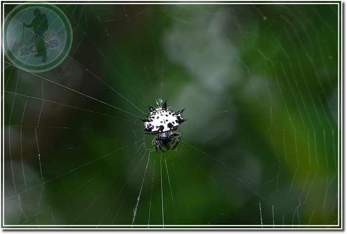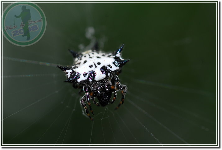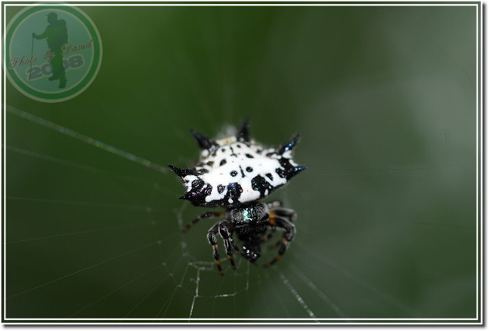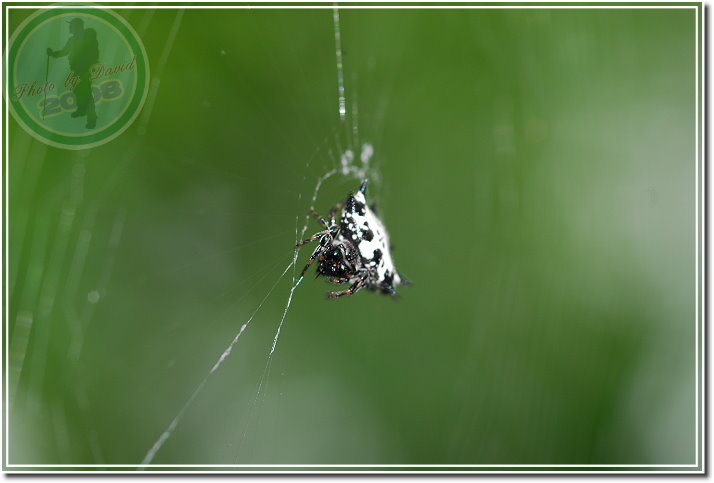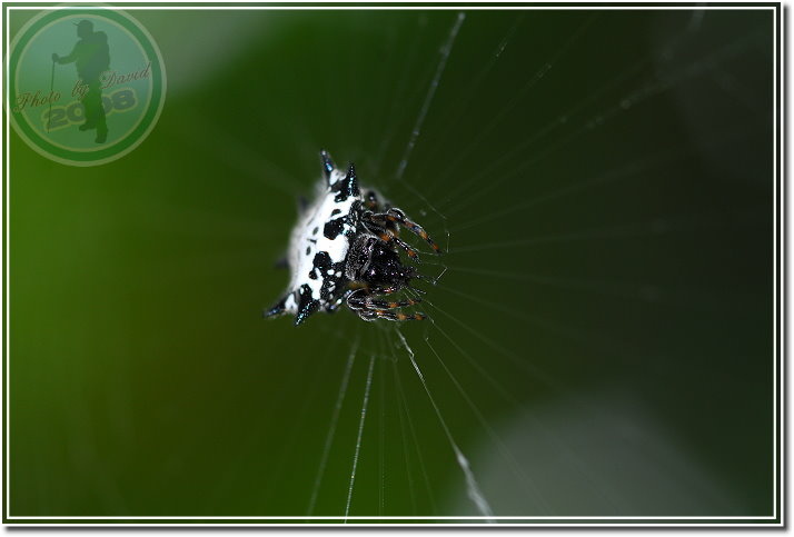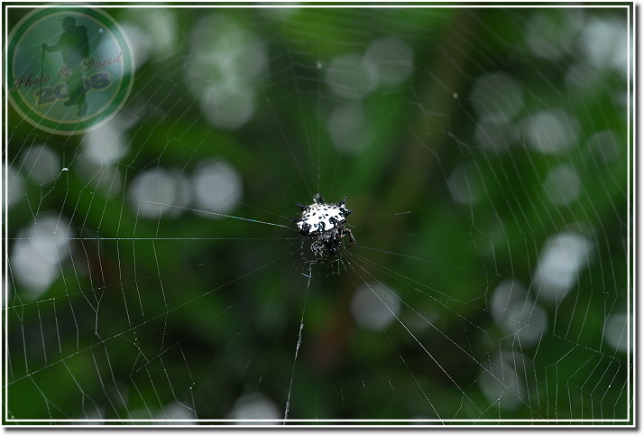 這隻「古氏棘蛛」是在集集特有生物保育中心的樹林子發現,比頭稍高的位子。第一次見到著實興奮,只覺得圖鑑裡的生物跳到日常生活來演出了。和同行的老友拿著相機猛拍,套句以前「瘋青蛙」時說的話:「拍得牠都快瞎了!」最後兩個人還拿著同一款近攝鏡頭比「誰拍出來的蜘蛛比較大」,一時之間又多閃了好幾次閃燈。