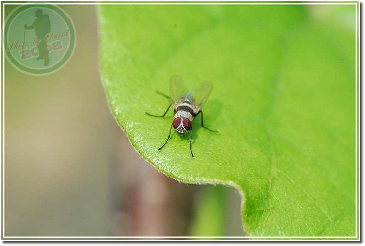 一般人大概不會近距離觀察蒼蠅,若在家裡通常以「蒼蠅拍」伺候,要觀察也是一團血肉模糊的蒼蠅。當然我不是自吹我也是武林高手,可以拿著微距鏡頭「拍」蒼蠅。而是這幾天寒流來襲,戶外即使在太陽底下氣溫也僅只13、4度,這對昆蟲而言可謂嚴厲的考驗。即使活躍矯健如蒼蠅也停棲在葉子、圍牆上反應遲鈍,讓我閒暇之餘有了可乘之機,慢慢地將鏡頭推近到10、20公分之近距離,得而細觀這惹人厭的傢伙。