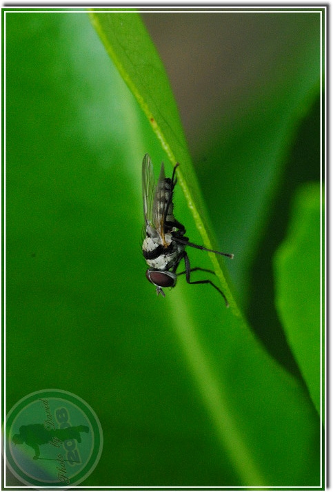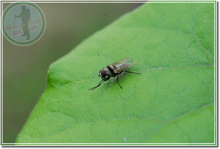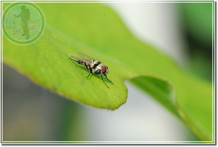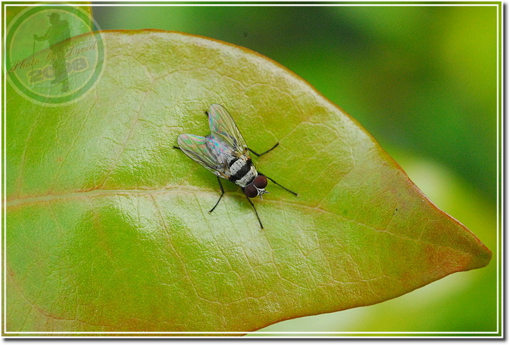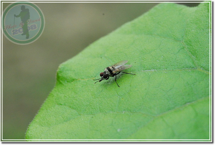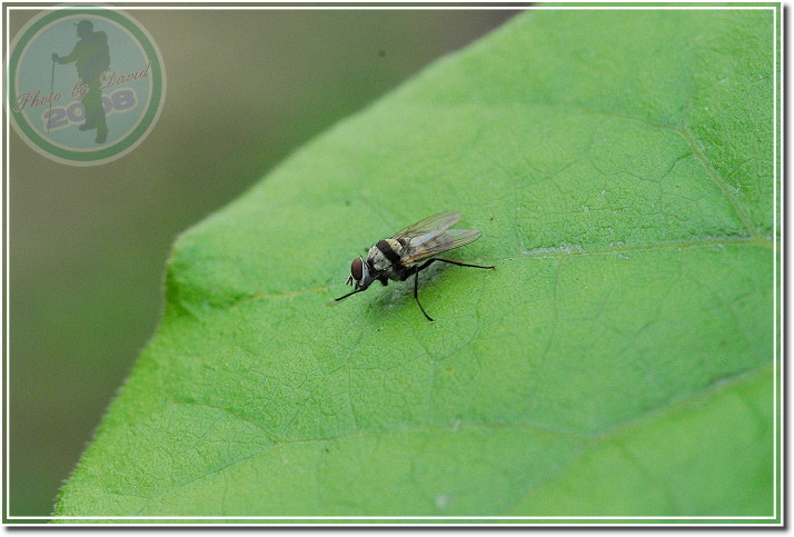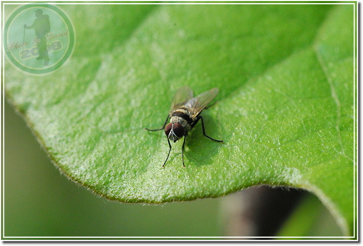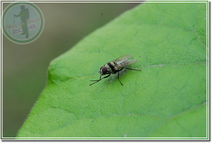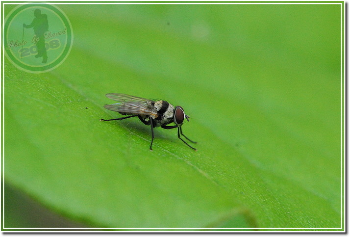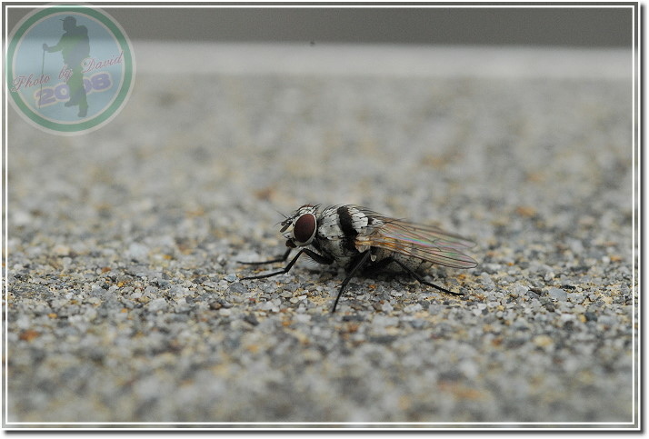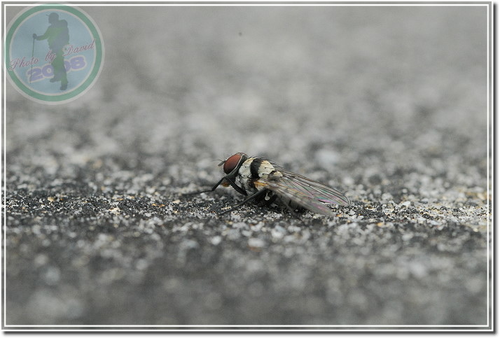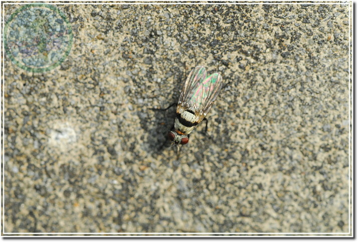 找了資料才知道蒼蠅家族還頗為繁複,分麗蠅、肉蠅、花蠅、寄生蠅、家蠅、大跗(ㄈㄨ,腳背)蠅各科。而這隻蒼蠅叫「花蠅」屬花蠅科,特徵為白色,前胸及腹背有黑色橫帶,腹末端長滿棘刺的鬃毛。我是覺得牠長得算是蒼蠅家族當中較為俊俏的,至少不會讓人只想一掌拍去吧。