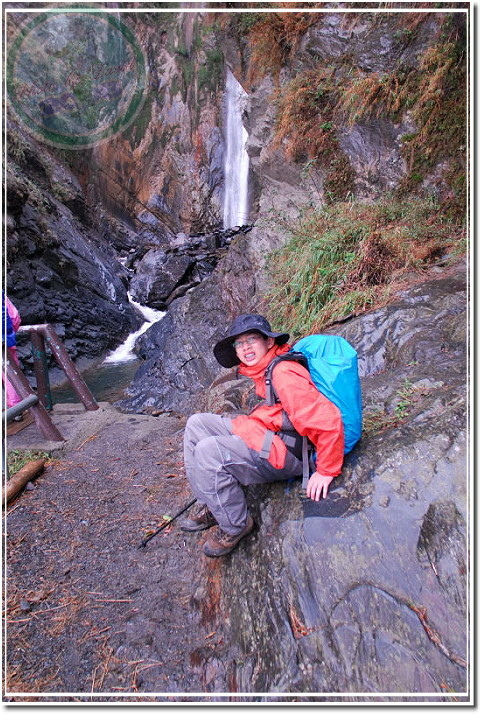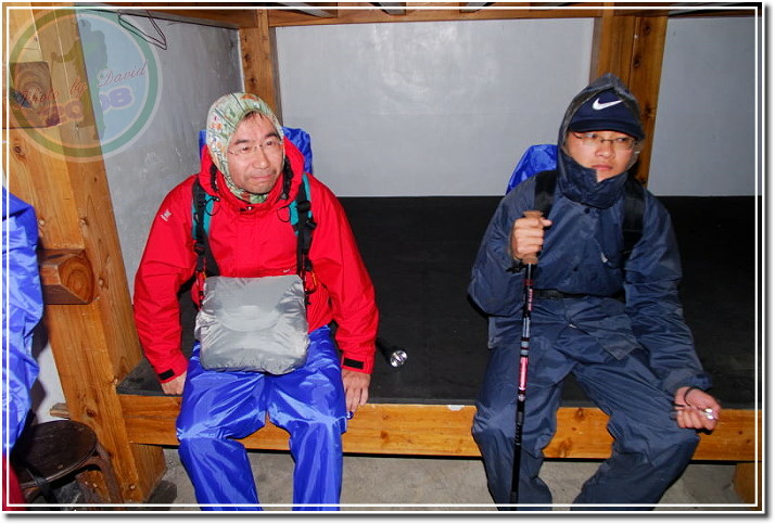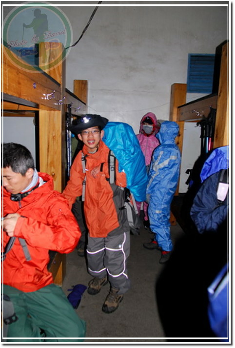 在山屋躺個回籠覺,直到天濛濛亮才由另兩位嚮導帶下山,這下子所有的登山裝備都派上用場,雨帽、雨衣、頭燈、綁腿、羽毛衣...通通上身。