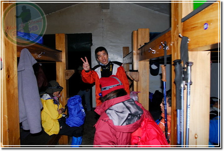 一覺醒來發覺「好運用完了」,昨天深夜裡看見遮住星空的飄雲已經偷偷連成一片,非但陽光沒了蹤影,空氣裡開始飄著像雨又像霧的水氣。清晨 3:00 嚮導叫醒所有隊友,請大家收拾行囊,並準備到隔壁山屋用早餐。