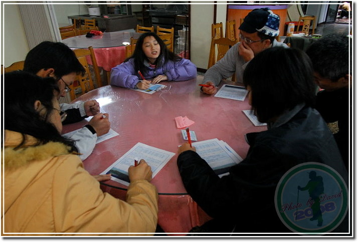 邊用餐嚮導邊徵詢大家的意見,依據他的經驗,此時的八通關必然也是相同的天氣,濕、冷、更壟罩在雲霧之中,所以要大家決定上攻還是下撤?大致上依照大家的意願分成兩隊。願意上攻者,用完早餐則依照原計畫將重裝備放置於觀高坪,輕裝走2公里一償宿願;想要打退堂鼓者,用完餐稍歇,天亮之後由嚮導帶下山去。