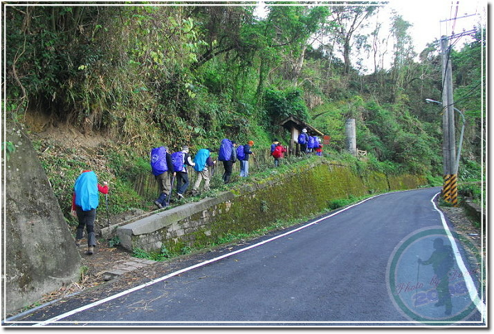 8:23 走完陡坡抵達第二登山口,殿後的響導、負責背負補給的原住民嚮導阿福也搭著小發財車珊珊來遲。據當地原住民說這第二登山口才是真正的起點,這裡是產業道路的盡頭,接下來便是一路緩坡直抵觀高。
