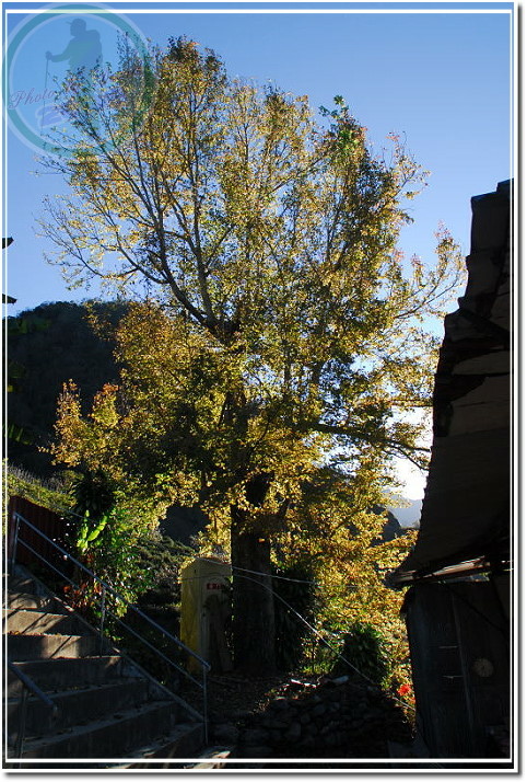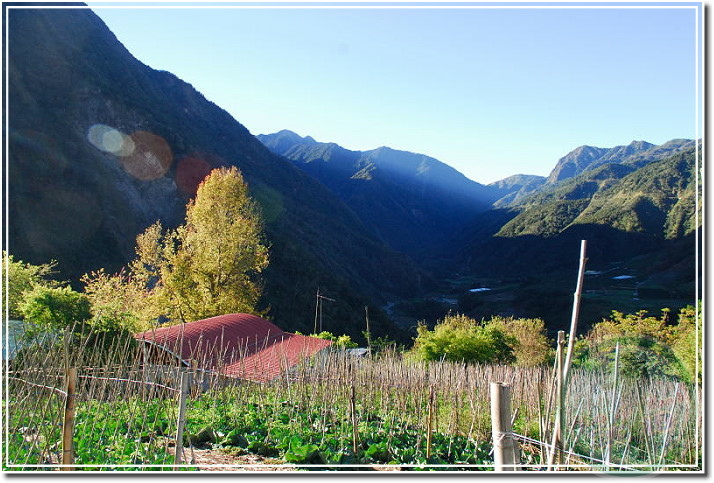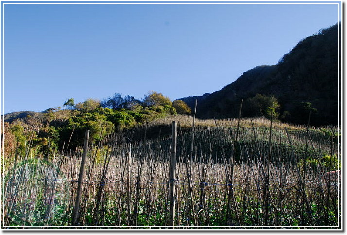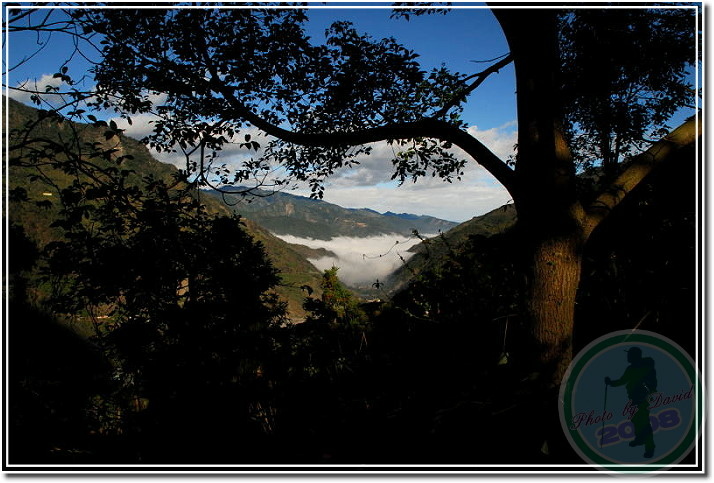 快到山腰出現一棟鐵皮棚,高高掛著「愛玉小站」的招牌。看來是專做登山客及遊覽瀑布遊客的生意,時間還早所以只見到椅子上放了幾顆愛玉果,沒看見老闆身影。這裡還有間廟,廟前有棵黃葉子的樹,在陽光照射及山谷襯托下很吸引人。放下背包也顧不著休息,四處蒐集美景。這裡有農戶在山頭插滿竹竿種番茄,蕃茄枯萎了,他就在竹架下種了碩大蓊鬱的高麗菜。密密麻麻的竹竿架起另一種「數大的美」,剛好與後頭背陽的山頭形成顏色的對比。愛玉小站對面可以看見剛剛上山時眺望的山谷,遠遠的雲海正波濤洶湧地想湧上來,看來得加快腳程,否則被這水氣趕上,輕則濃霧罩頂墜入五里霧中;重則下雨行路艱難了。